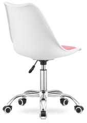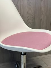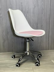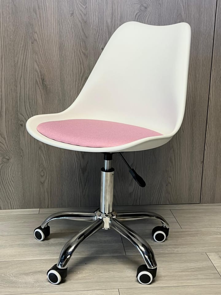 Nowoczesne krzesło obrotowe do biurka w kolorze białym, z miękką różową poduszką z tkaniny i chromowaną podstawą.