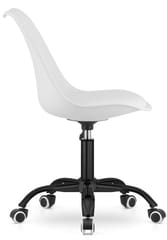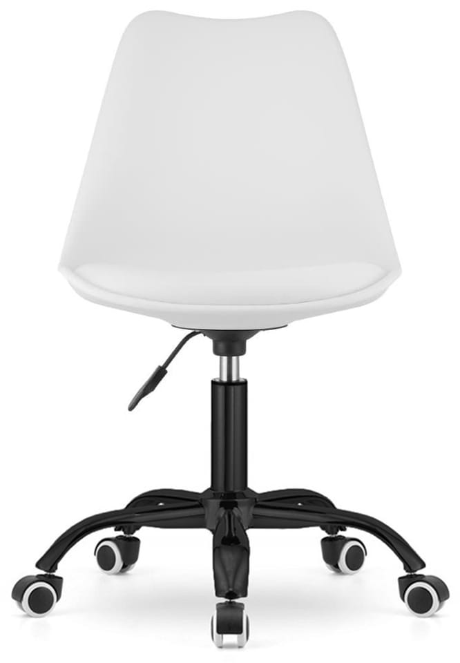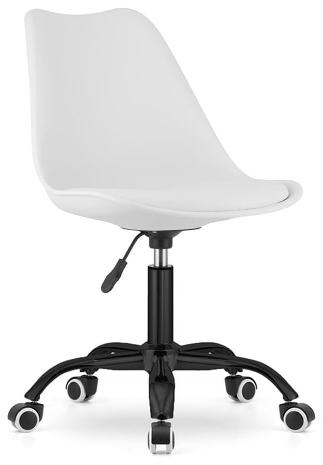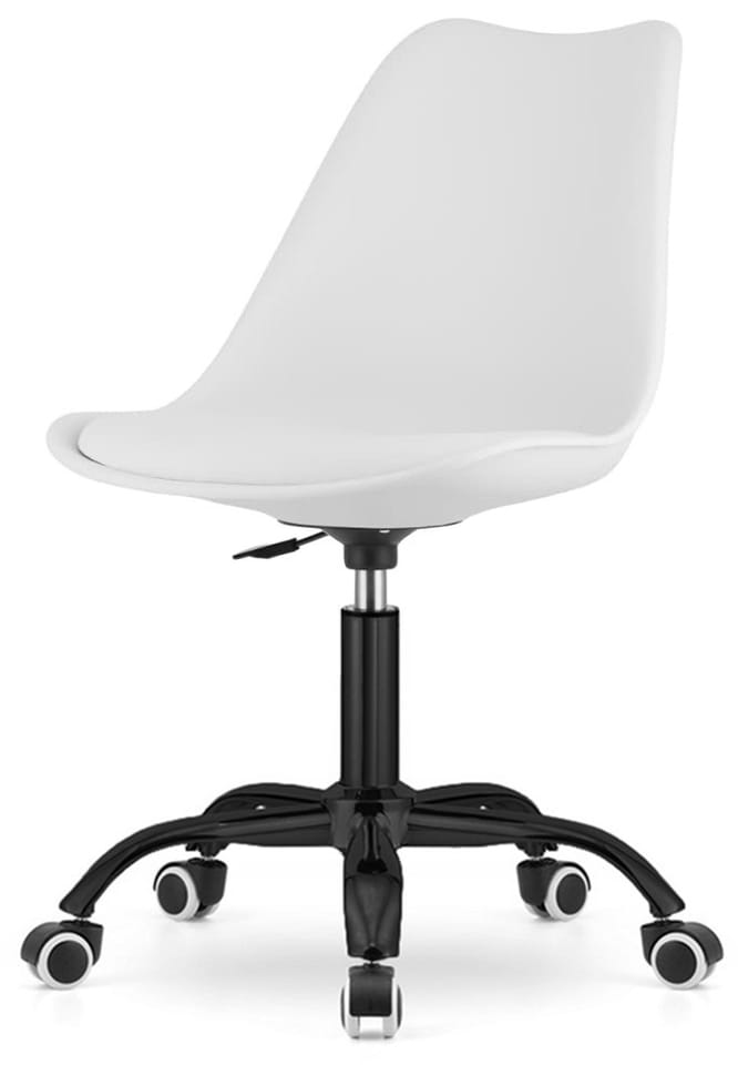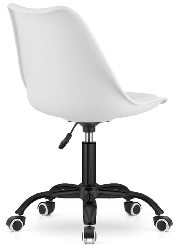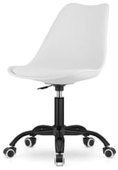 Nowoczesne krzesło obrotowe do biurka w kolorze białym, z miękką poduszką siedziska i czarną podstawą.