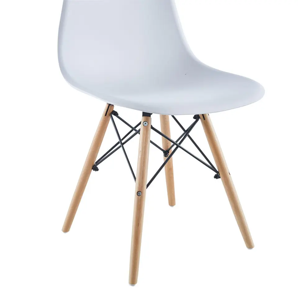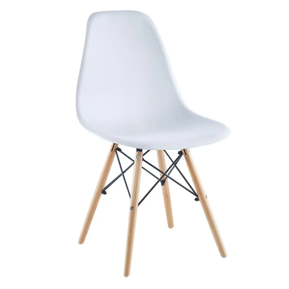 Opływowy kształt siedziska, nadaje mu delikatnego i miękkiego wyrazu. Wygodę siedzenia zapewnia odpowiednie wyprofilowanie. Tworzywo sztuczne o matowym wykończeniu gwarantuje odpowiednią wytrzymałość. 4 drewniane nogi, z rozpiętymi metalowymi prętami, nadają krzesłu lekko industrialny charakter.