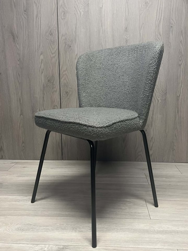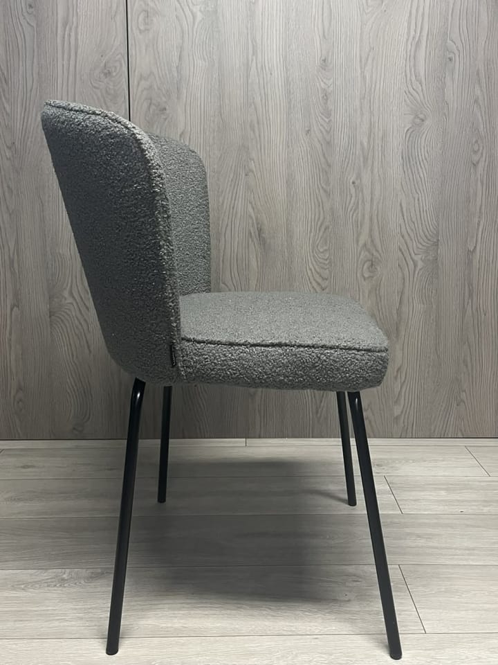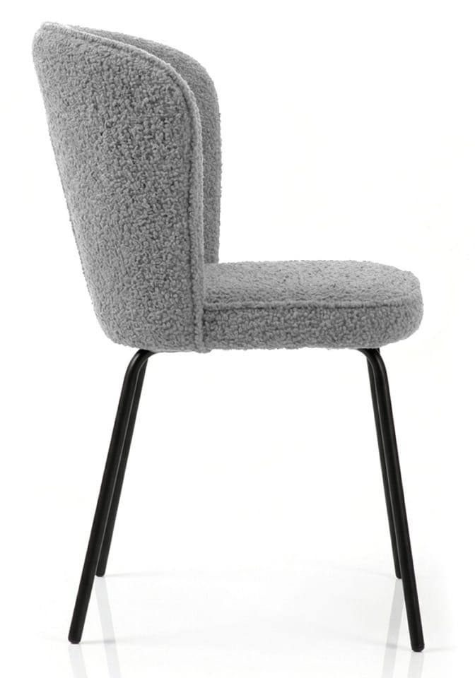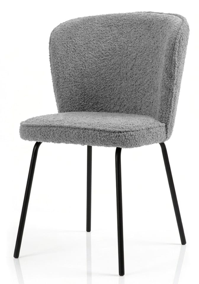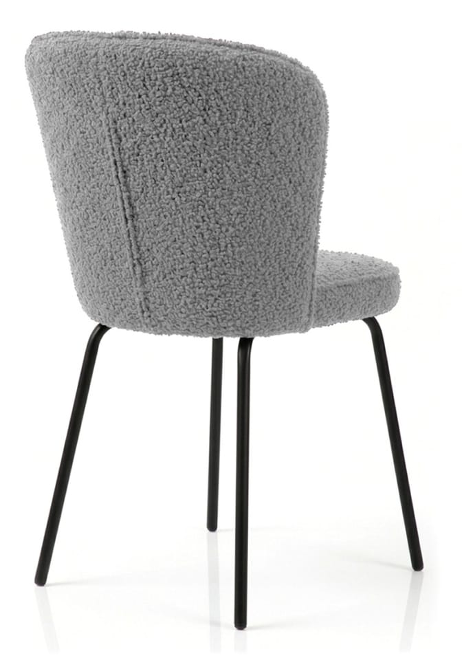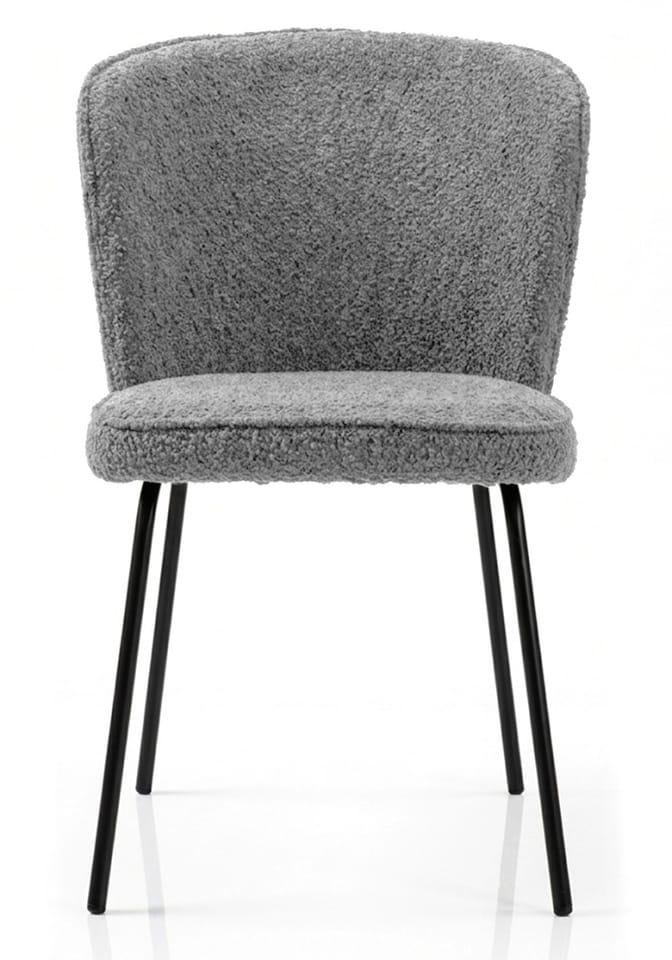 TEDDY BLACK - Nowoczesne krzesło tapicerowane tkaniną typu boucle (efekt owczej wełny) w kolorze szarym na czarnych metalowych nogach.