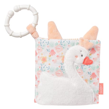 Książeczka edukacyjna, Łabędź, z kolekcji: Jezioro Łabędzie Wraz z uroczym Łabędziem, Twoje dziecko przeżyje niesamowite przygody. Piękna, miękka pierwsza książeczka. Na tytułowej stronie wita nas prześliczny, biały łabędź w miękkiej koronie do chwytania. Po otwarciu odkrywamy bezpieczne małe lusterko, oraz uśmiechniętego ślimaczka. Na kolejnych stronach wita nas różowe serduszko, wesoły zajączek, uśmiechnięty kwiatek oraz pierzasta chmurka. Ukryta piszczałka, szeleszczący papier, różnorodne struktury powierzchni wzbudzają ciekawość i kształcą zmysł dotyku. Dzięki elastycznemu pierścieniowi w kształcie litery ""C"" możemy łatwo zamontować przy nosidełku, wózku czy łóżeczku. Zabawka przeznaczona dla dzieci od najwcześniejszych dni, pobudzająca do chwytania, potrząsania, ściskania. Niezbędna do poznawania świata, wzbudzająca ciekawość, jednym słowem potrzebna zawsze i wszędzie. Każda strona, to nowe doświadczenie dla maluszka. Przyjazne w dotyku materiały. Bezpieczne lusterko. Elementy interaktywne takie jak piszczałka, lusterko, szeleszczące kartki i różnorodne faktury materiału stymulują zmysły. Rozwija zdolności motoryczne i manualne. Rozmiar 11 x 11 cm Wszystkie zabawki niemieckiej marki FEHN są bezpieczne dla dzieci od 0 lat. Wykonane są z najlepszej jakości materiałów. Spełniają normy EN71, CE, badane w instytutach ""Stiftung Warentest"" lub ""Ökotest”. 62120