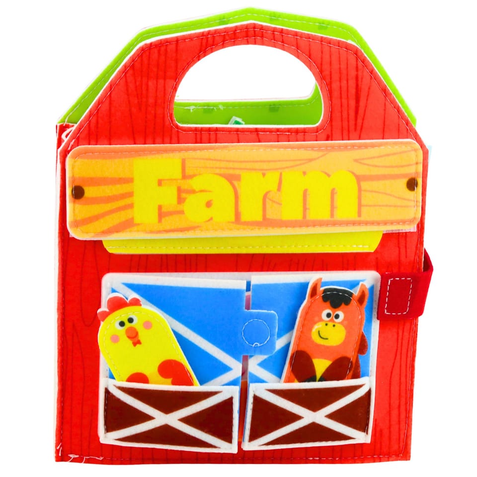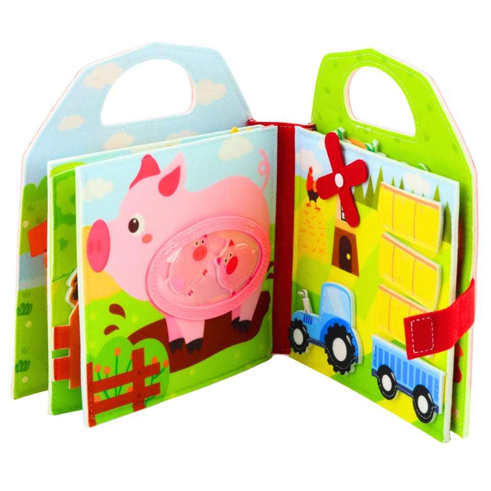 Na stronach książeczki znajdują się różnorodne elementy wykonane z miękkiego filcu, które można dopasowywać, przekładać oraz przemieszczać. Dziecko może odkrywać kolejne scenki przedstawiające zwierzęta, takie jak krowa, koń, świnka czy kaczka, a także elementy gospodarstwa. Tego typu zabawa rozwija koordynację ręka oko, spostrzegawczość oraz zdolności manualne.
