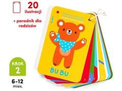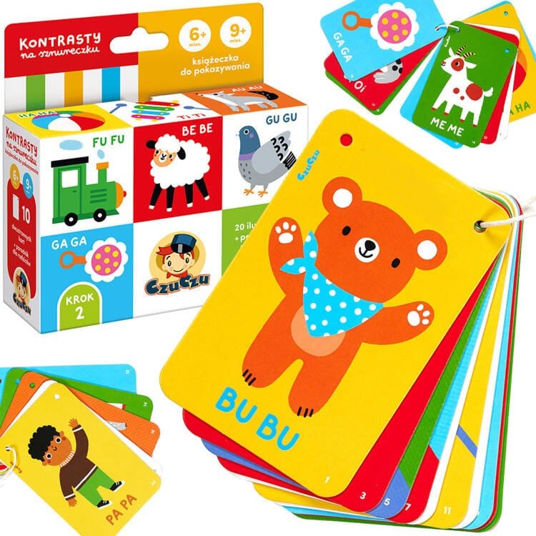 Zobaczcie, co dla mamy dla najmłodszych czytelników!Ta poręczna książeczka na sznureczku ma 20 stron. Pełne humoru, kontrastowe kolorowe ilustracje przyciągają wzrok i uwagę dziecka i pozwalają na mnóstwo kreatywnych zabaw. Oglądajcie książeczkę razem. Wskazuj i nazywaj detale na obrazkach. Zachęć malucha do wydawania odgłosów. To doskonały sposób na pobudzanie wyobraźni i wspólne spędzanie czasu. Do zestawu dołączyliśmy poradnik z informacjami o rozwoju niemowląt i pomysłami na zabawy.Wyjątkowa cecha: ilustracje przyciągają wzrok i uwagę maluszków.Hej, maluchy i rodzice! Mamy świetne pomysły na zabawy ze starszym niemowlakiem: oglądajcie, czytajcie, słuchajcie, mówcie, pokazujcie i odkrywajcie razem świat! Książeczka do pokazywania Kontrasty na sznureczku dla dzieci w wieku 6-9 miesięcy to książeczka, która pozwoli Wam w wyjątkowo przyjemny sposób spędzać razem czas i zainspiruje do mnóstwa zabaw.Pokazuj maluchowi detale ilustracji i zachęć do tego samego pilnuj, aby robić to palcem wskazującym.Nazywaj to, co na nich widać i zachęć dziecko do wydawania odgłosów. Podpisy na ilustracjach to inspiracja do wydawania dźwięków. W drugim półroczu życia maluchy gaworzą to ważny etap w rozwoju mowy. Reaguj na zainteresowanie dzieckaKtóre obrazki należą do ulubionych? Czy wokół siebie możecie znaleźć odpowiedniki tego, co widać na ilustracjach? Baw się formą książeczkiKarty książeczki mają 2 dziurki możesz dzięki temu używać ich po swojemu: pojedynczo, tworząc klasyczną książeczkę lub girlandę, albo stworzyć obrazek w ramce.Zabawy ruchowePostaw książeczkę w zasięgu dziecka, aby zachęcić go do sięgania i przemieszczania się.W drogę!Format książeczki sprawia, że z łatwością zmieści się w wózku czy torebce warto mieć ją zawsze pod ręką.Dajcie się ponieść wyobraźniy! A gdy maluch skończy rok, odkryj kolejne propozycje na wspólne zabawy.