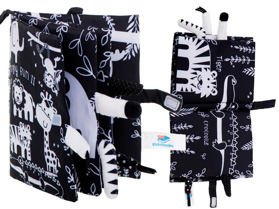 Magiczna materiałowa książeczka w kontrastowe wzory to świetna propozycja dla dzieci dopiero poznających świat. Biało czarne zwierzątka będą doskonałym wstępem do poznania świata afrykańskich stworzeń.