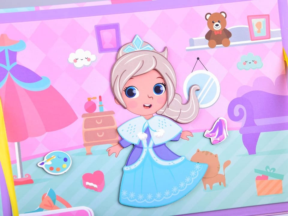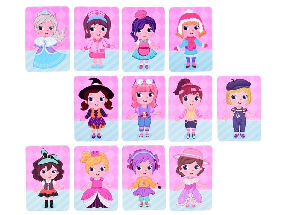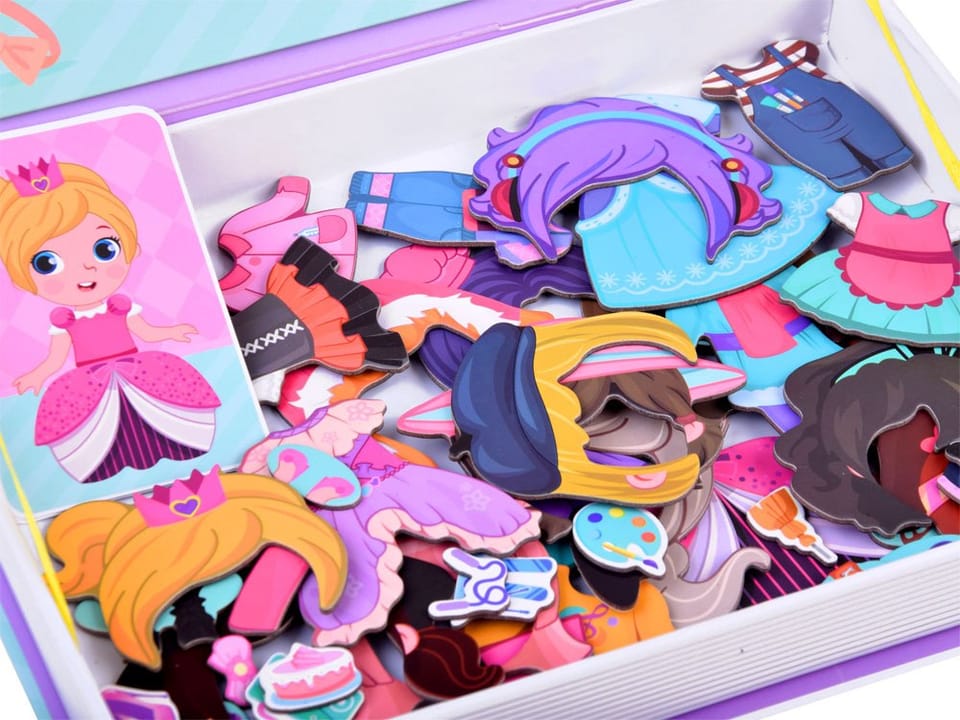 Magnetyczna układanka zawiera 51 kolorowych magnesów z elementami dziewczęcych strojów, dzięki którym można się stać np.