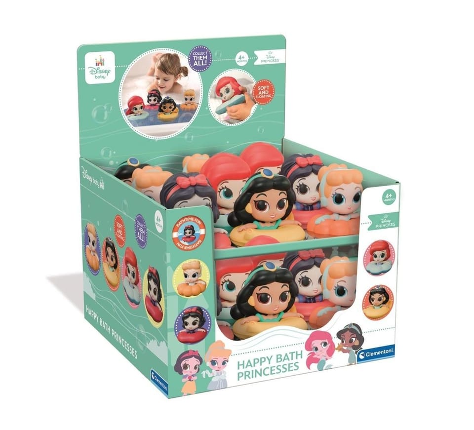Znane i kochane Księżniczki Disneya w wersji zabawek do wody. Wykonane z miękkiej gumy unoszą się na powierzchni. Każda Księżniczka posiada spersonalizowane koło pływackie. Display zawiera 4 różne Księżniczki.