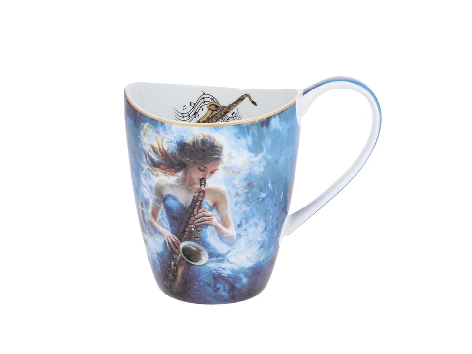 Poczuj harmonię w każdym łyku herbaty. Porcelanowy kubek ze stylowym podcięciem, zdobi artystyczny motyw przedstawiający kobiety grające na instrumentach, który wprowadza do codziennej rutyny nutę elegancji i muzycznej inspiracji.