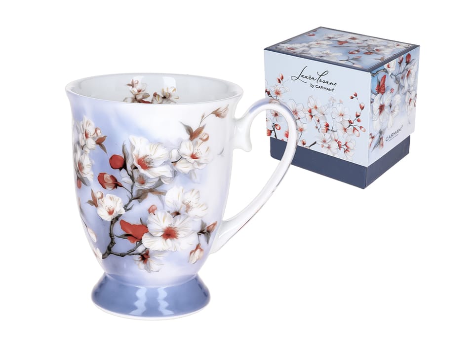 Elegancki kubek z wysokiej jakości porcelany z kwiatową dekoracją i dedykowanym pudełkiem prezentowym - polecamy na prezent dla bliskiej osoby lub jako elegancki dodatek do własnej kuchni.