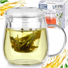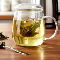 Szklany kubek z zaparzaczem i pokrywką. Kubek ma pojemność 400 ml. Idealny do parzenia herbaty liściastej, ziół oraz naparów.