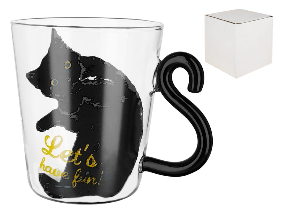 Szklany kubek z fikuśmym uchem z kociego ogona, ucieszy każdego miłośnika kotów.