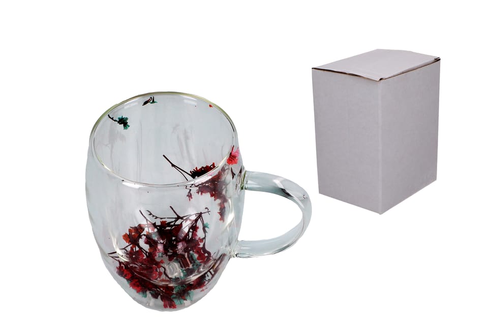 Kubek szklany z podwójnymi ściankami i kwiatami.