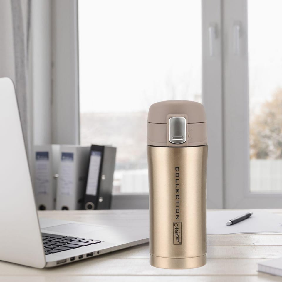 Kubek termiczny Maestro MR-1641-32-GOLD to doskonały wybór dla osób, które cenią sobie wygodę oraz długotrwałe utrzymywanie temperatury napojów. Posiada pojemność 320 ml i jest wykonany z wysokiej jakości stali nierdzewnej 18/10, co zapewnia trwałość oraz odporność na uszkodzenia.