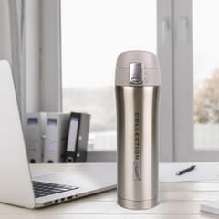 Wyposażony w korek otwierany za pomocą przycisku oraz wygodny "dziubek" do picia, umożliwia picie bez konieczności odkręcania pokrywy. Dodatkowo posiada blokadę otwierania, która zapobiega przypadkowemu wylaniu napoju. Kubek jest szczelnie zamykany dzięki podwójnej uszczelce, a jego obudowa ze stali szczotkowanej nadaje elegancki wygląd.