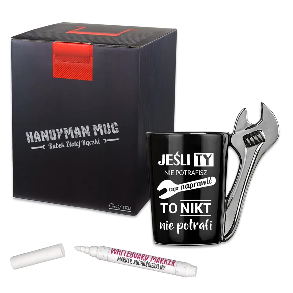 - Do zestawu dołączono: marker suchościeralny. Nadruk jednostronny. Napis na produkcie: Jeśli ty nie potrafisz tego naprawić, to nikt nie potrafi. Produkt w polskiej wersji językowej. Materiał: ceramika. Wymiary: 14,5 cm (wysokość), 400 ml (pojemność). Nadaje się do kontaktu z żywnością. Produkt bezpieczny