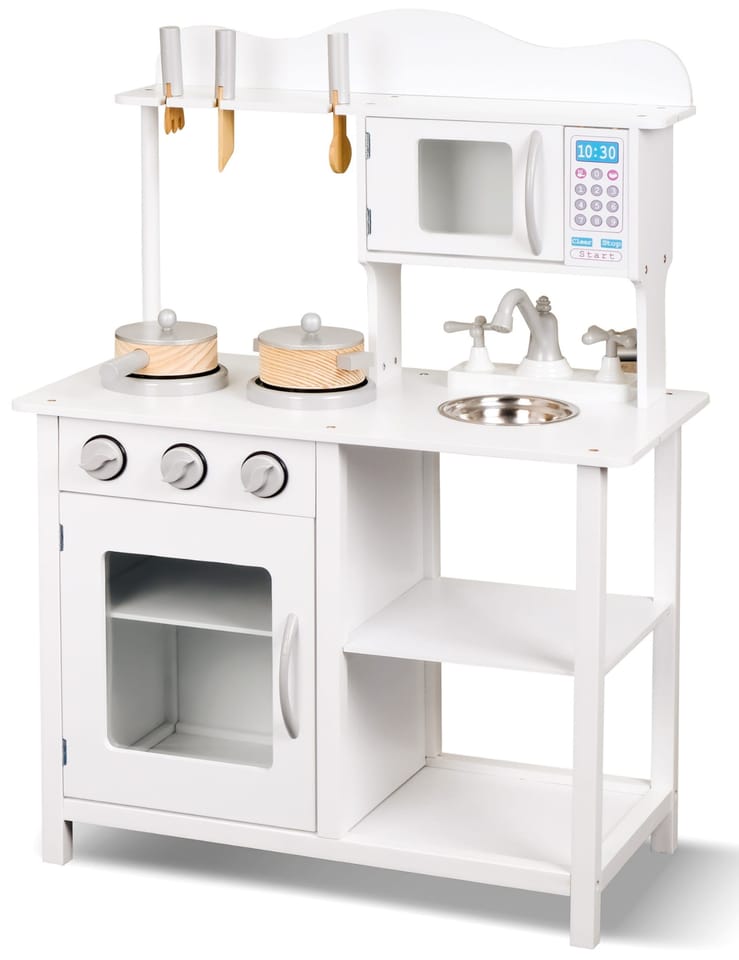 Kuchenka drewniana wygląda zdecydowanie lepiej od plastikowej. Staje się pełnoprawnym meblem w pokoju dziecięcym. Otwierane piekarnik i mikrofalówka mogą pełnić funkcję szafek - są idealne do przechowywania produktów lub sprzętów kuchennych.