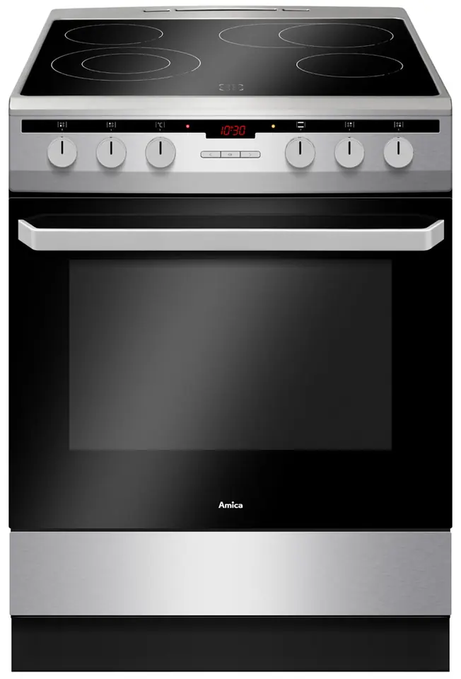 Kuchnia z płytą ceramiczną 618CE3.434HTaKDQ(Xx), marki Amica, o szerokości 60 cm, w klasie energetycznej A. Model ten wyposażony jest w programator elektroniczny Ta oraz 4 pola HiLight. Piekarnik o pojemności 66 l posiada 10 funkcji pieczenia oraz wnętrze komory pieczenia pokryte emalią łatwoczyszczącą.