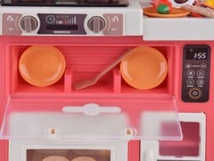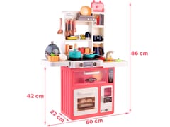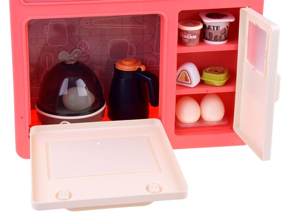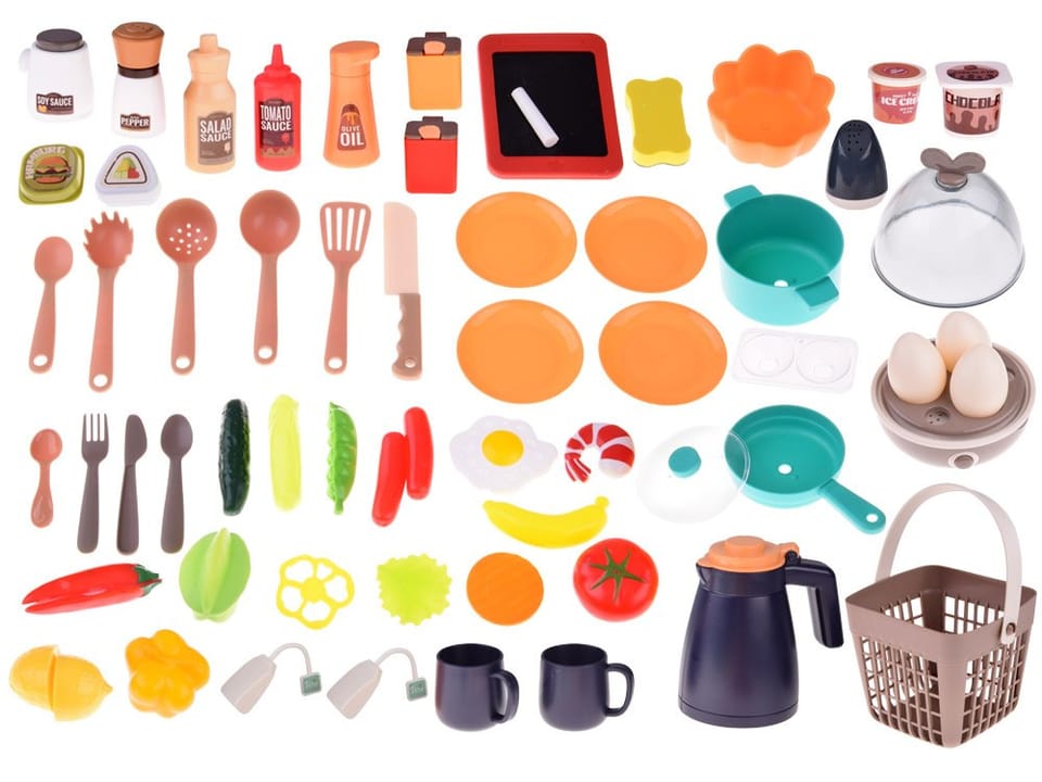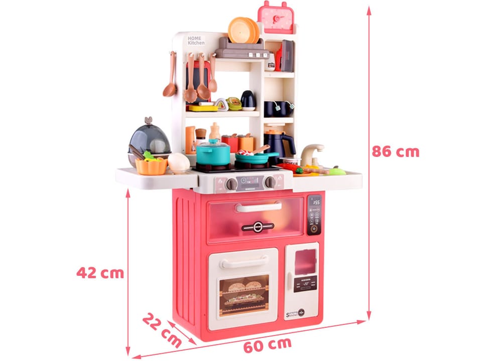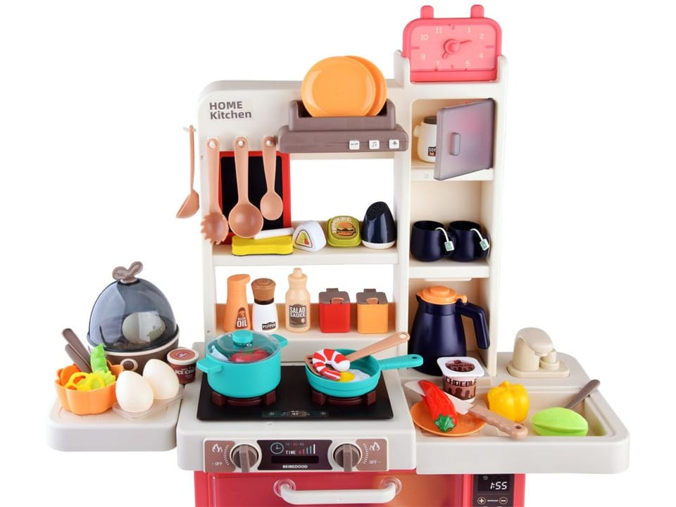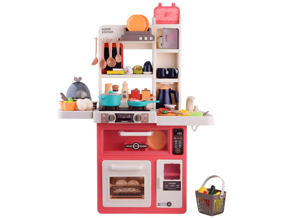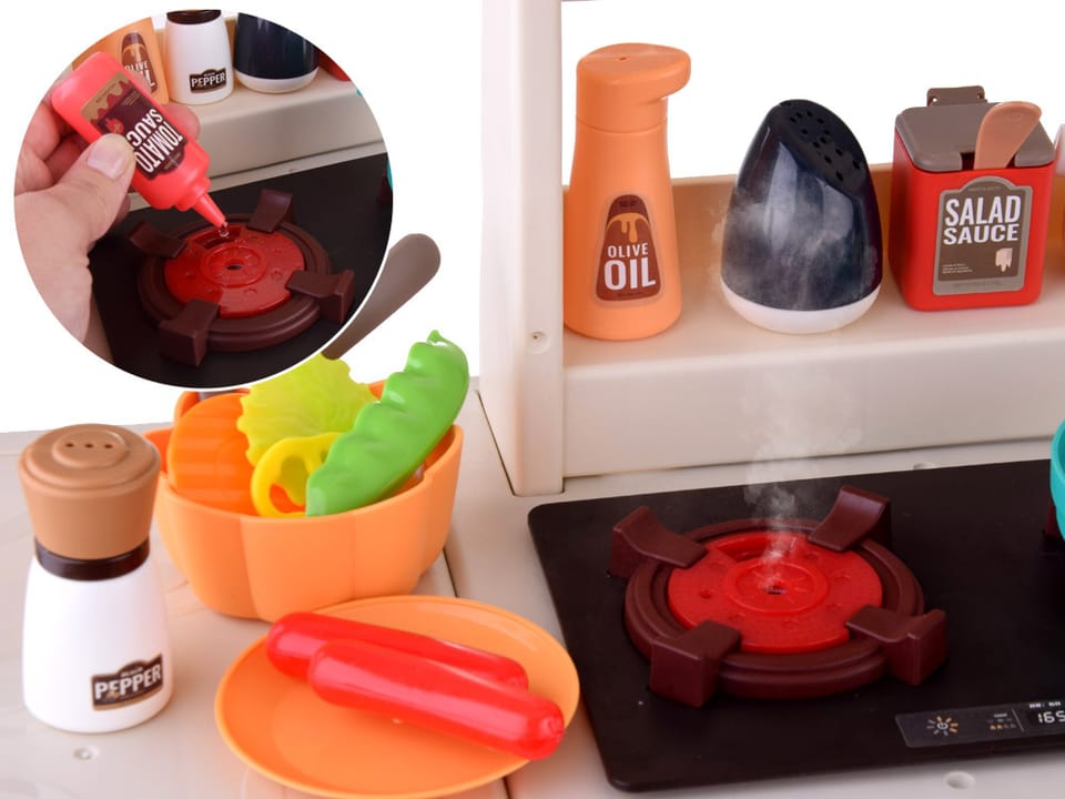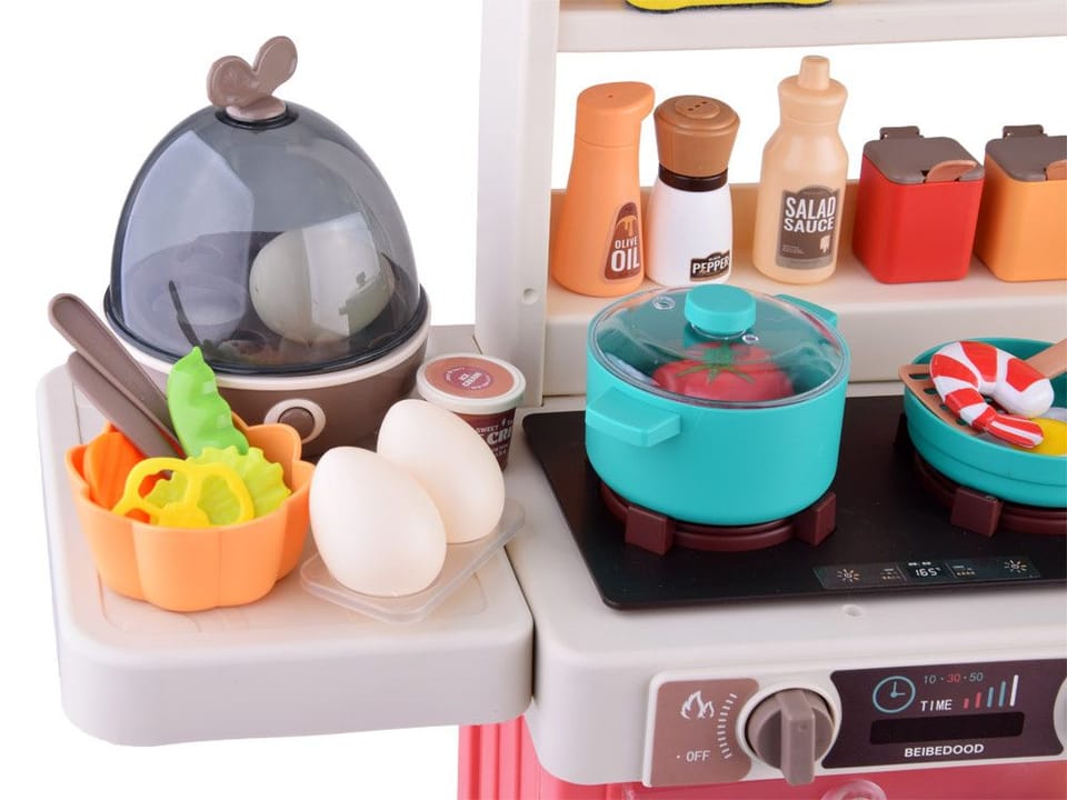 Co znajdziesz w kuchni? - Kuchenka gazowa z efektem dźwiękowym, parowym i świetlnym. Kuchnia jest wyposażona we wbudowane lampki LED, które odzwierciedlają realistyczne efekty świetlne podczas gotowania. Po przekręceniu palników na kuchence słychać odgłosy gotowania i towarzyszy im mruganie czerwonego światełka. Dodatkowym efektem specjalnym jest para przy gotowaniu (wystarczy wlać odrobinę wody w otwór przy palniku). Palniki na kuchence wydzielają nieszkodliwą parę, co dodaje efektu autentyczności podczas zabawy w gotowanie. Po włączeniu pierwszego pokrętła włącza się pierwszy palnik, świecą światła oraz z palnika wydobywa się para imitująca parującą wodę. Wszystkiego temu towarzyszy dźwięk gotującej się wody (para nie jest gorąca, całkowicie bezpieczna). - Woda w kranie - kuchnia posiada kran z wodą. Obieg zamknięty, woda wylatuje z kranu poprzez naciskanie przycisku (pompki), który pozwoli maluchowi na odgrywanie różnych scenek, takich jak gotowanie, zmywanie naczyń czy podlewanie roślin. - Tablica kredowa do zapisywania menu, listy zakupów - mała tablica do zapisywania krótkich wiadomości, lub do spisywania listy zakupów, świetnie sprawdzi się w kuchni. Dziecko na bieżąco będzie mogło zapisywać swoje pomysły, listy zakupów, wiadomości. Kreda oczywiście jest w komplecie. - Jajowar do gotowania jajek - jajowar z efektem dźwiękowym i świetlnym, ma za zadanie ugotować 3 jajka, które są w komplecie. Gotowaniu towarzyszy efekt dźwiękowy i świetlny, jajka kręcą się w trakcie gotowania, co dodaje realistycznego efektu.