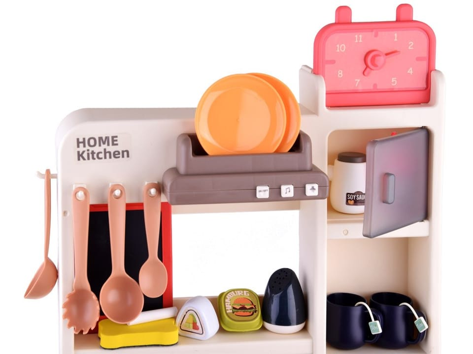Mnogość półeczek, szuflad, haczyków sprawia iż kuchnia jest bardzo realistyczna, a mały kucharz świetnie się w niej odnajdzie.