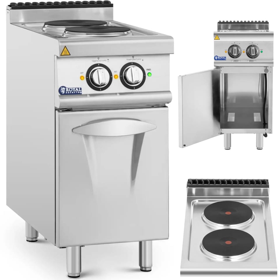 Kod producenta: 10013389Kuchenka elektryczna marki Royal Catering sprawdzi się w branży gastronomicznej. Dodatkowo zawiera dolną szafkę na przybory kuchenne. Wyposażona została w dwa palniki, każdy o mocy 2600 W i średnicy 23 cm (łącznie 5,2 kW). Każdy z palników zniesie obciążenie aż do 10 kg. Temperatura regulowana jest za pomocą dużych przycisków umieszczonych z przodu urządzenia do 450deg;C w trzech stopniach. W przypadku przegrzania kuchnia elektryczna wyłączy się automatycznie, zwiększając tym samym bezpieczeństwo podczas pracy. Nóżki o regulowanej wysokości zapewniają urządzeniu stabilną pozycję nawet na nierównym podłożu. Obudowa i drzwi kuchenki elektrycznej wykonane zostały z wysokiej jakości stali nierdzewnej, wytrzymałej i higienicznej. Gładkie powierzchnie są odporne na większość zabrudzeń i łatwe w czyszczeniu.Cechy produktu: