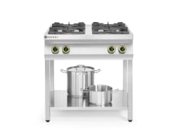 Kod produktu: 1010153Kuchnia gazowa 4-palnikowa Hendi na otwartej podstawie to urządzenie zaprojektowane z myślą o profesjonalnych kuchniach hotelowych, restauracyjnych oraz firmach cateringowych. Blat kuchni został wykonany ze stali nierdzewnej AISI 304, a obudowa ze stali nierdzewnej AISI 430. Obie charakteryzują się wysoką wytrzymałością, odpornością na wysokie temperatury oraz są łatwe w czyszczeniu. Kuchenka wyposażona jest w dwa palniki o mocy 6000 W oraz dwa o mocy 3500 W zasilane gazem GZ50 (dysze na LPG w zestawie). Na każdym palniku znajduje się mocny żeliwny ruszt (wymiary: 335 x 300 mm) umożliwiający pracę z garnkami o średnicy od ø120 - 300 mm. Stalowe nóżki umożliwiają regulacje wysokości kuchni w zakresie od 100 do 165 mm, co znacznie zwiększa komfort pracy. Dodatkowo urządzenie wyposażone jest w termoparę i zabezpieczenie przeciw wypływowe gazu w przypadku zgaszenia płomienia.Cechy produktu: