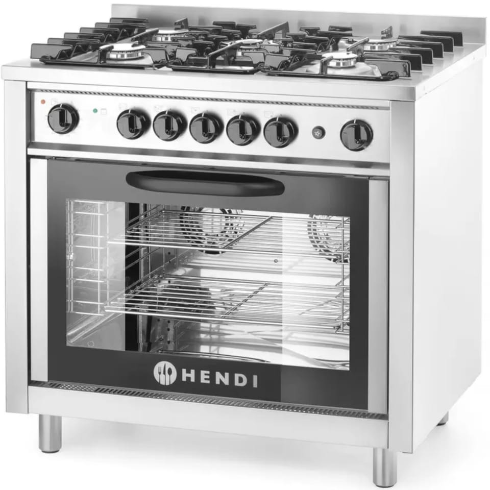 Numer producenta: HENDI 225707Profesjonalna kuchenka gazowa marki Hendi z serii Kitchen Line. Urządzenie wyposażone jest w 5 palników gazowych, 3 duże 3 kW, 1 mały 1,8 kW, 1 palnik wok 3,5 kW i piec konwekcyjny. Piekarnik przystosowany został do użycia 4 pojemników lub rusztów o rozmiarze GN 1/1. Posiada dodatkowy górny element grzewczy o mocy 2,5 kW umożliwiający grillowanie potraw. Komora jest oświetlona aby zwiększyć komfort użytkowania.Cechy produktu:
