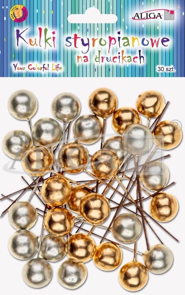 Kuleczki styropianowe na drucikach złote i srebrne roz. 1cm. dł. 7cm. op. 30szt. KSB-4658 ALIGA