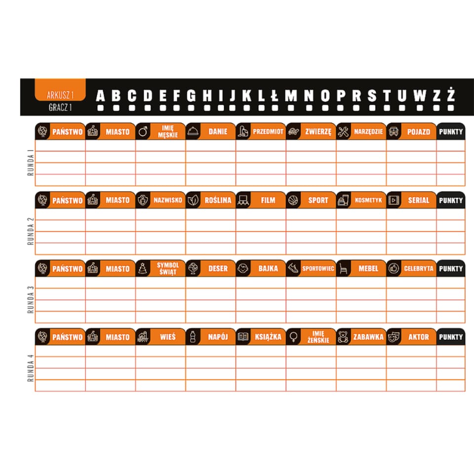 Każdy z graczy losuje literę alfabetu, a następnie w określonym czasie wpisuje słowa w różnych kategoriach, takich jak państwo, miasto, zwierzę, przedmiot czy imię. Punkty zdobywa się za poprawne i unikalne odpowiedzi, a wygrywa osoba, która zdobędzie ich najwięcej. Gra jest szybka, dynamiczna i gwarantuje wiele emocjonujących rund.