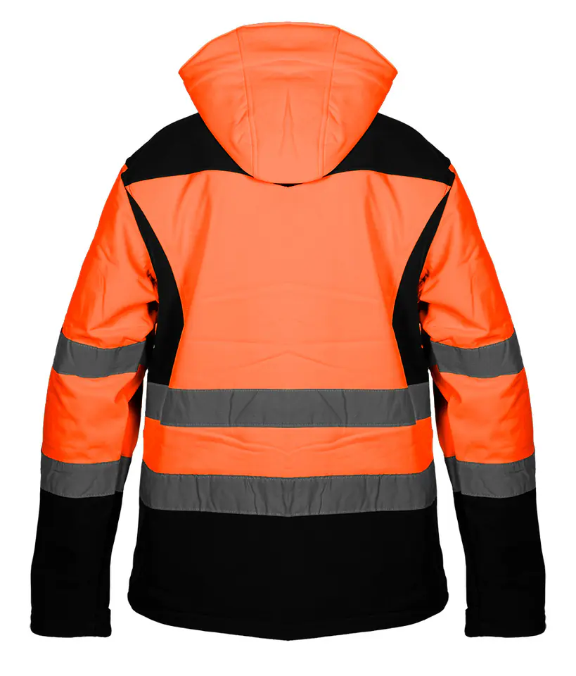 Kurtka robocza ostrzegawcza softshell z kapturem, pomarańczowa, rozmiar M, o intensywnej widzialności, klasa 2 wg. normy EN ISO 20471, wodoodporność 8000 mm, oddychalność 3000 g/m2/24h, wiatrochronna, wewnętrzna strona polarowa, 4 kieszenie zapiane na suwak, kieszeń wewnętrzna zapianana na rzep, ściągacz w rękawach na rzep, regulowany ściągacz w pasie, odpinany kaptur ze ściągaczem, certyfikat CE, EN ISO 13688:2013