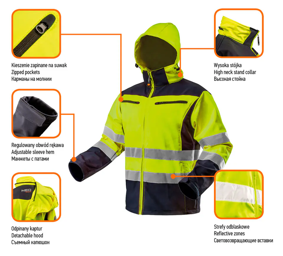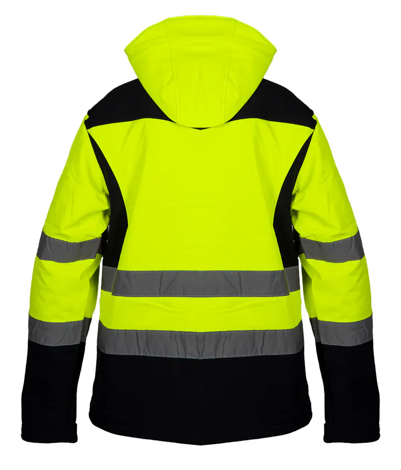 Kurtka robocza ostrzegawcza softshell z kapturem, żółta, rozmiar L, o intensywnej widzialności, klasa 2 wg. normy EN ISO 20471, wodoodporność 8000 mm, oddychalność 3000 g/m2/24h, wiatrochronna, wewnętrzna strona polarowa, 4 kieszenie zapiane na suwak, kieszeń wewnętrzna zapianana na rzep, ściągacz w rękawach na rzep, regulowany ściągacz w pasie, odpinany kaptur ze ściągaczem, certyfikat CE, EN ISO 13688:2013