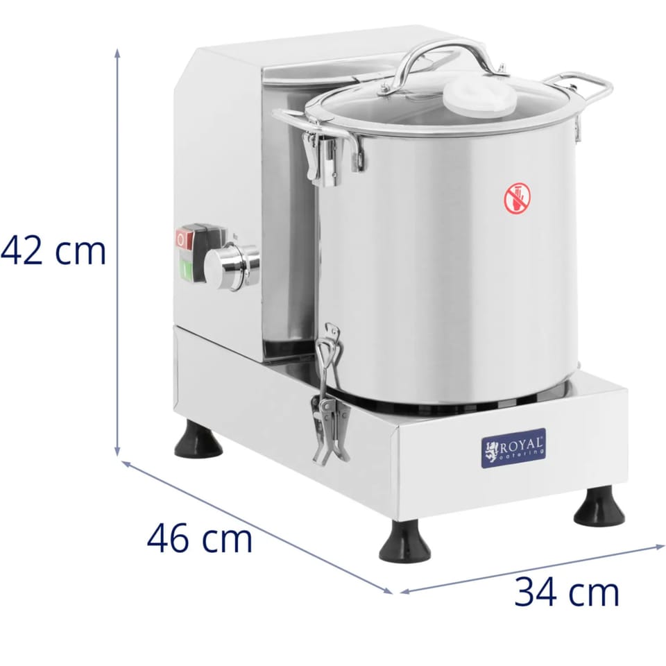 Kod producenta: 10013096Kuter gastronomiczny marki Royal Catering pozwala posiekać lub zmiksować warzywa, mięso czy zioła, aby szybko i skutecznie przygotować zupy, pasztety lub podobne potrawy. Moc wyjściowa urządzenia wynosi 1800 W a prędkość obrotowa 1800 - 3500 obr./min, co pozwala przetworzyć nawet duże ilości jedzenia w mgnieniu oka. Misa wykonana została z wytrzymałej stali nierdzewnej i zachwyca wysokiej jakości wykończeniem. Gładkie powierzchnie są łatwe w czyszczeniu. Nóż do siekania pozwala rozdrobnić wszystkie produkty spożywcze z dużą prędkością. Jakość wykonania ostrza gwarantuje idealne cięcie bez negatywnego wpływu na obrabiany produkt. Wyjmowane naczynie ma pojemność 9 l, co pozwala przetworzyć do 8.3 l jedzenia. Plastikowa osłona chroni przed zachlapaniem podczas pracy. Urządzenie obsługiwane jest za pomocą przycisku. Cztery antypoślizgowe gumowe nóżki zapewniają odpowiednią stabilność przy maksymalnej prędkości. Ze względów bezpieczeństwa ostrza poruszają się tylko wtedy, gdy pojemnik jest mocno przymocowany do urządzenia.Cechy produktu: