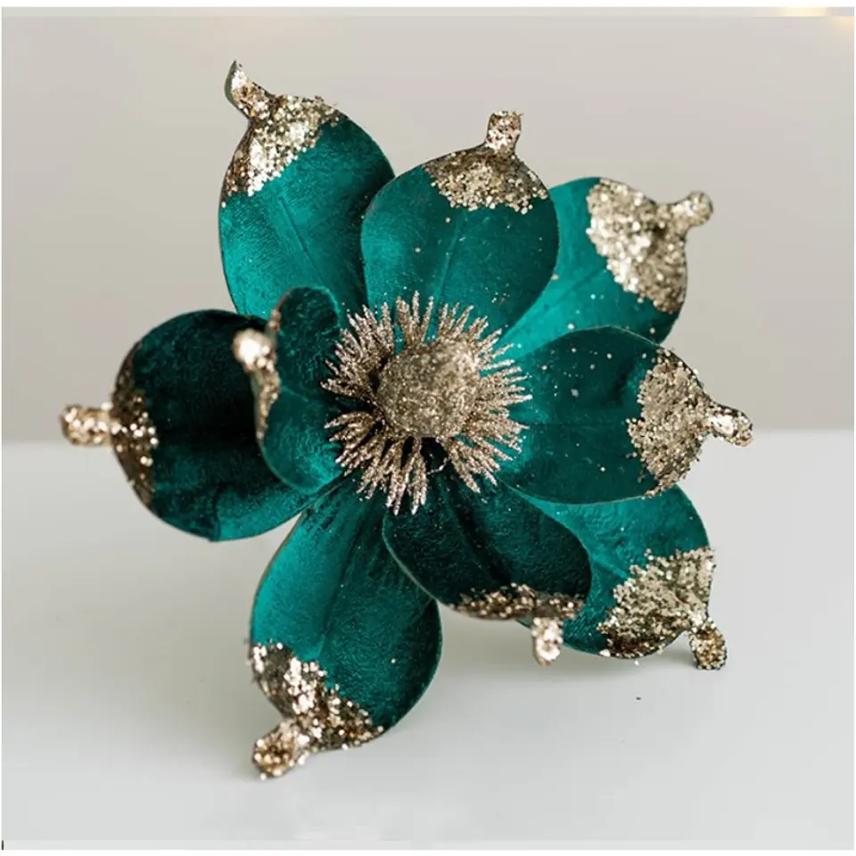 Kwiat na choinkę BOŻE NARODZENIE cekiny WOZ24 Materiał: Tworzywo sztuczneKolor: ZIELONY, ZŁOTY Wymiary: ok 20 x 20 cm