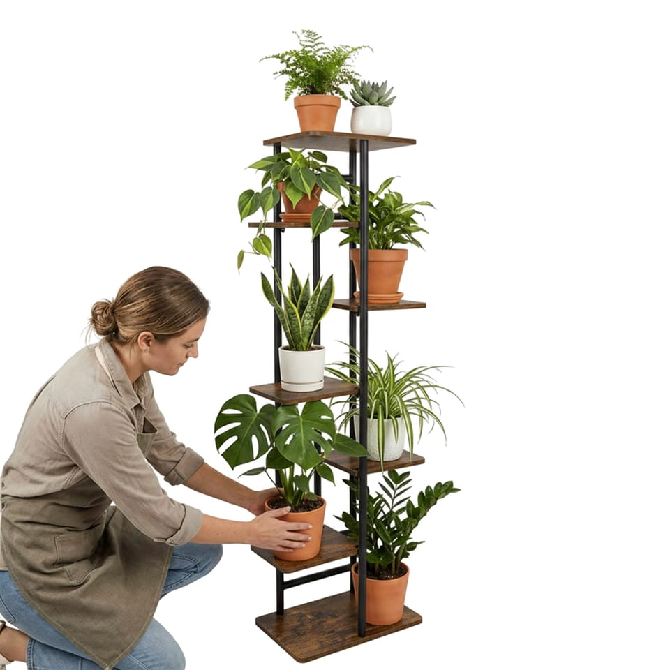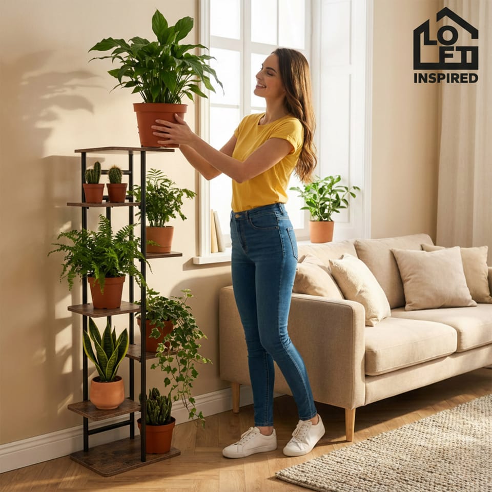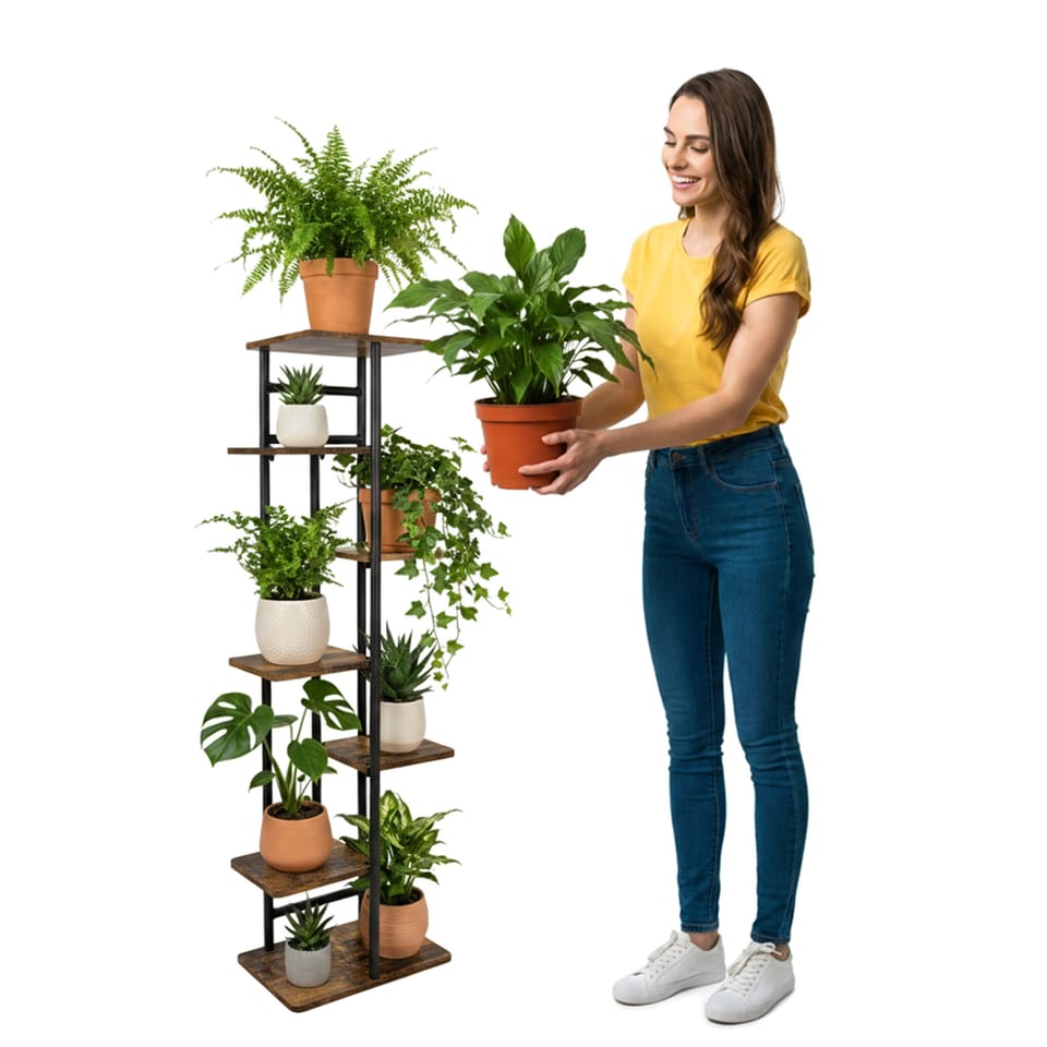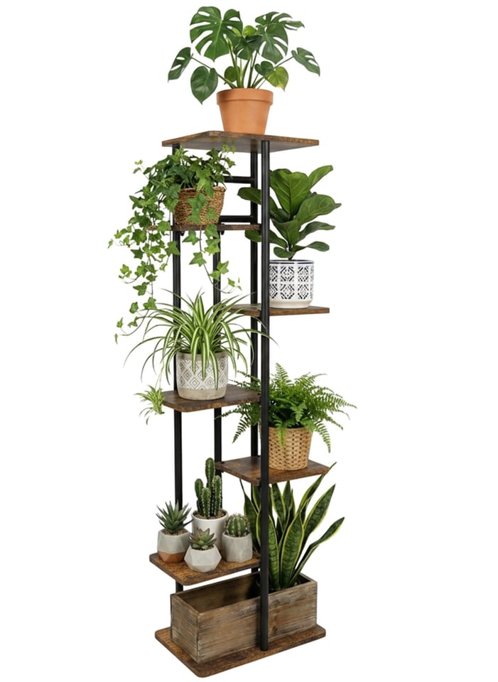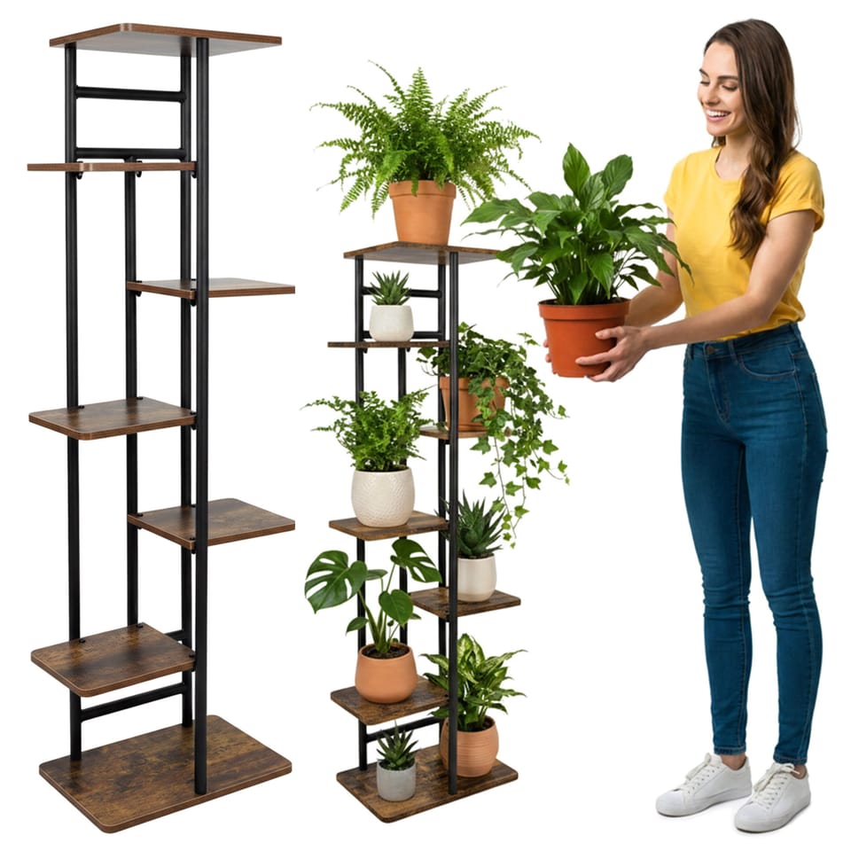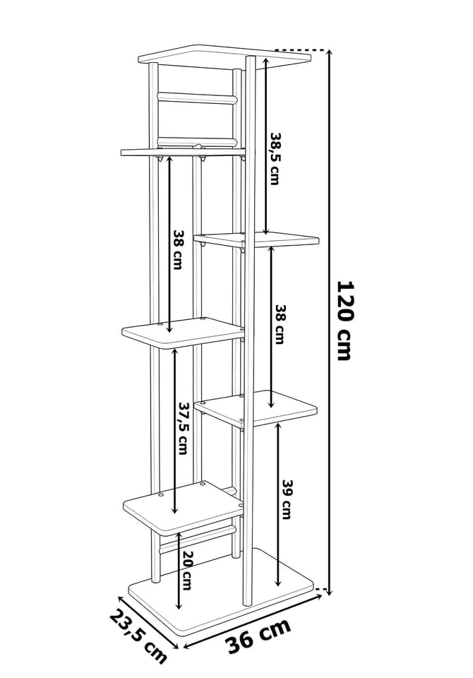 Kwietnik metalowy stojak na kwiaty BASTIAN rusticModel: Bastian | Kolor: Grafitowy mat/rustic ⭐️ 7 półek na ekspozycję kwiatów i dekoracji⭐️ Metalowa konstrukcja malowana proszkowo na grafitowy mat⭐️ Półki w odcieniu rustic⭐️ Podkładki ochronne, zabezpieczające podłogę⭐️ Zakup od producenta ☑️ Specyfikacja:Materiał konstrukcji: Stal malowana proszkowo na grafitowy matMateriał półek: Płyta laminowana w kolorze rusticLiczba półek: 7Maksymalne obciążenie jednej półki: 5 kgCechy dodatkowe: Śruby w kolorze czarnym, podkładki chroniące podłogę☑️ Wymiary:Wysokość całkowita: 120 cmSzerokość całkowita: 36 cmGłębokość całkowita: 23,5 cmWymiar najwyższej półki: 23,5 x 30 cmWymiar najniższej półki: 23,5 x 36 cmWymiar małych półek: 18,5 x 22 cmGrubość płyty: 1 cmProfil konstrukcji: 2 cmInformacje dodatkowePrzedstawione kolory należy traktować poglądowo - mogą odbiegać od rzeczywistych ze względu na różne ustawienia monitorów oraz proces obróbki zdjęć. Rzeczywiste wymiary mogą się różnić od podanych wyżej. Tolerancja błędów może wynosić +/- 5%.Marka:LoftInspiredEAN:5905523069839Kolor:rustic, grafitowy matWysokość:120 cmSzerokość:36 cmGłębokość:23,5 cmDo samodzielnego montażutak