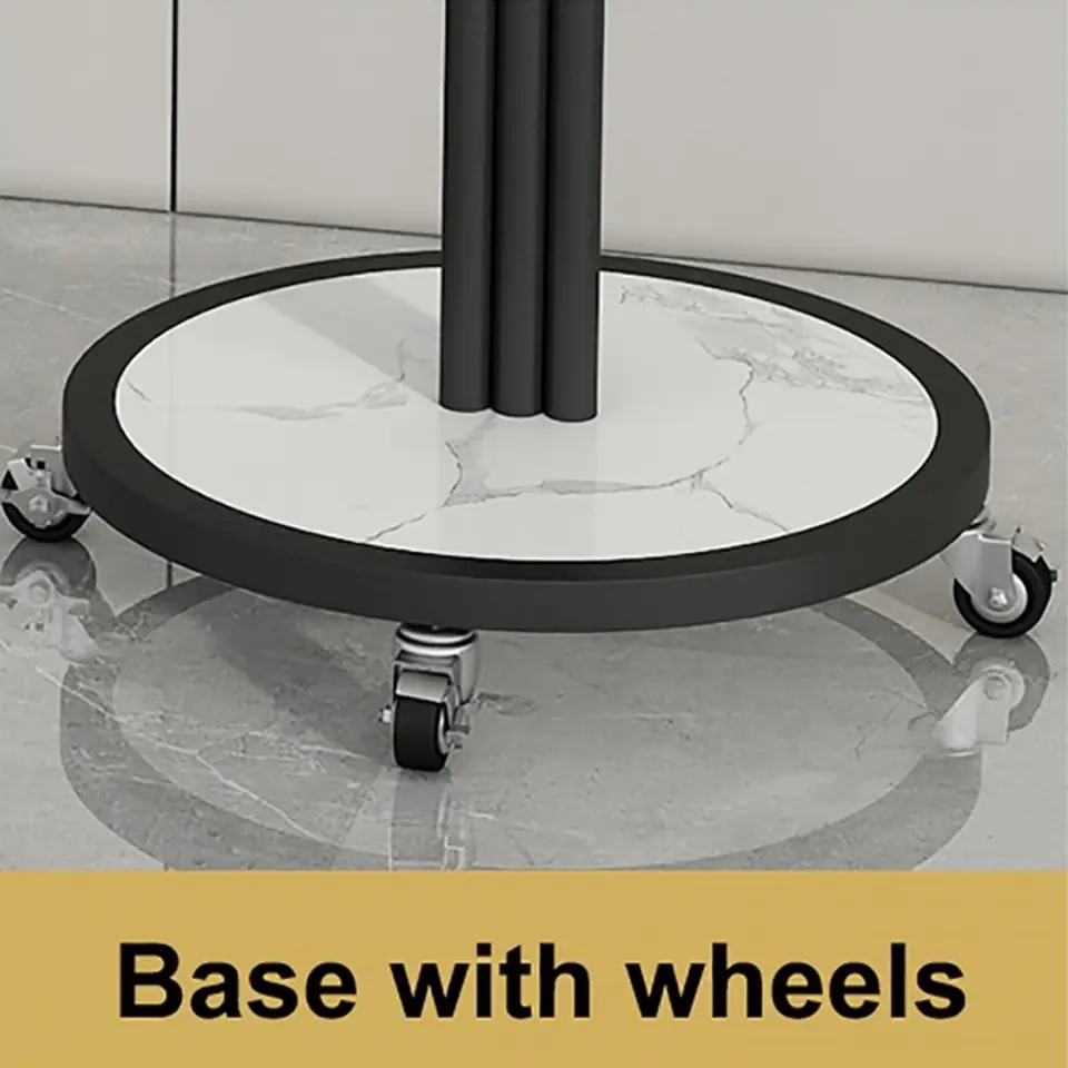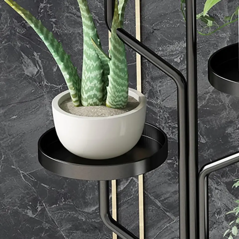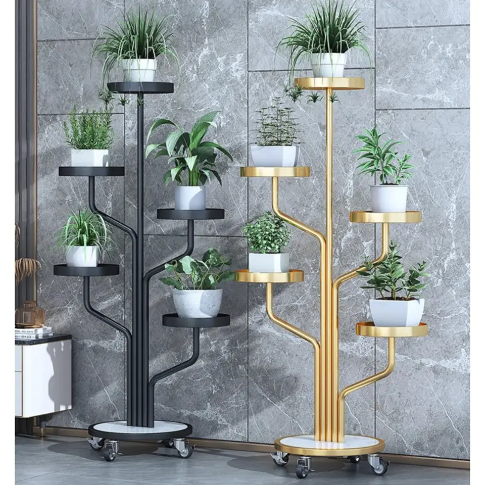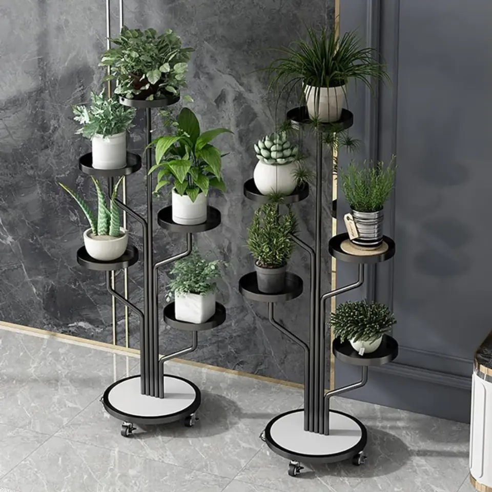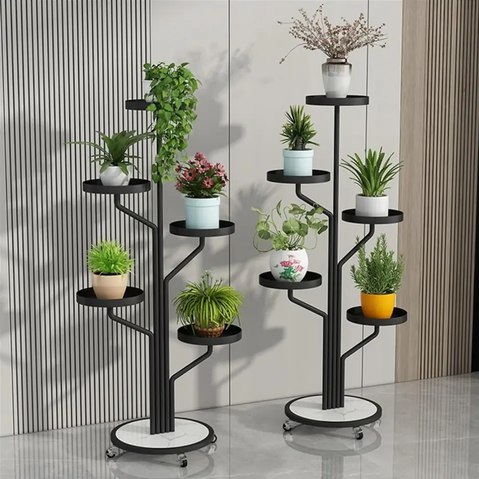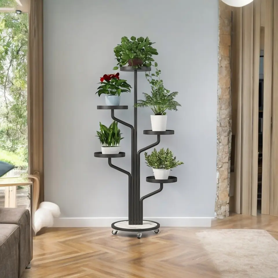 Stojak, kwietnik na rośliny na kółkachWytrzymały stojak na rośliny z 4 kółkami. Łatwy do przenoszenia, nawet dzieci mogą go łatwo przesuwać w dowolne miejsce.Półka jest bardzo stabilna, rama jest wykonana z wytrzymałego materiału. Twoje rośliny w końcu będą pięknie wyeksponowane. Dzięki 5 półkom pomieści sporę ilość doniczek.Stwórz swoją własną kwietną kompozycję! Perfekcyjnie sprawdzi się na balkonie, tarasie, ogródku jak i wewnątrz domu. Specyfikacja:- 5 półek.- Rama z metalu.- Blaty metalowe.- Podstawa z metalu płyty laminowanej- Maksymalne obciążenie jednej półki: 2 kg.- 4 kółka z blokadą- Produkt do samodzielnego montażu. Kolor ramy: czarnyKolor płyty: biała imitacja marmuru Wymiary po złożeniu:Średnica podstawy: 40 cmWymiary pudełka:127 cm x 48,5 cm x 8,5 cmWaga z pudełkiem:6,5 kg