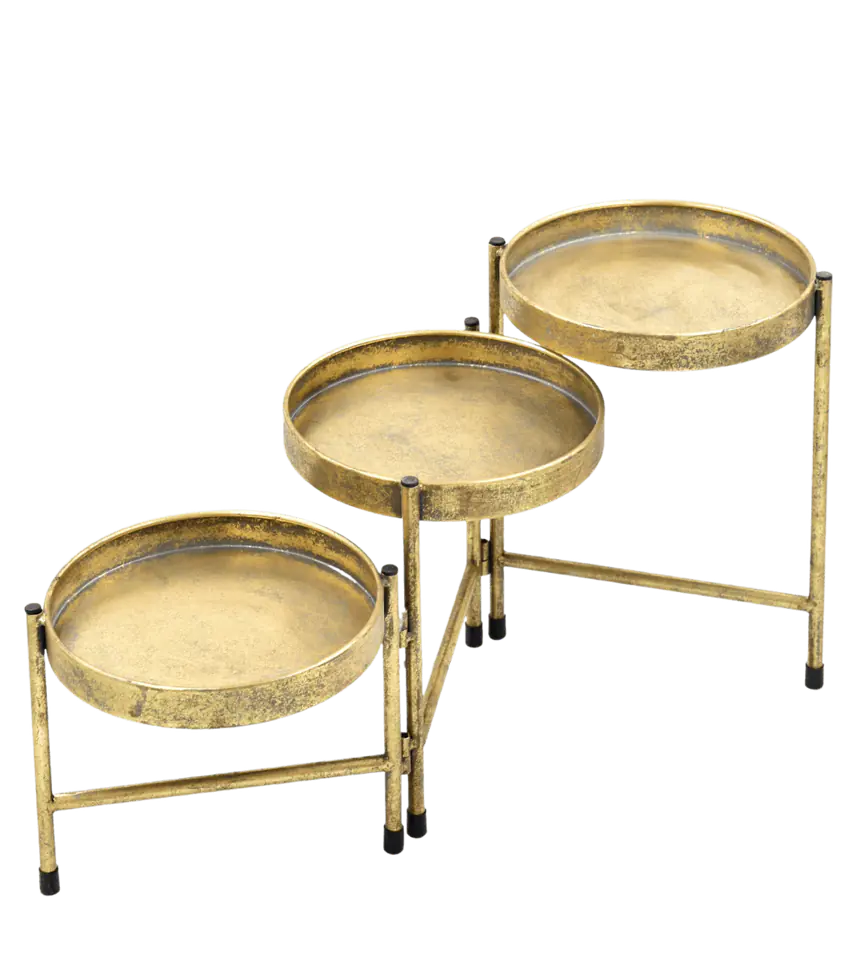 Kwietnik rozkładany z trzema okrągłymi podstawkami. Mały stolik, który umieścisz np. na komodzie.