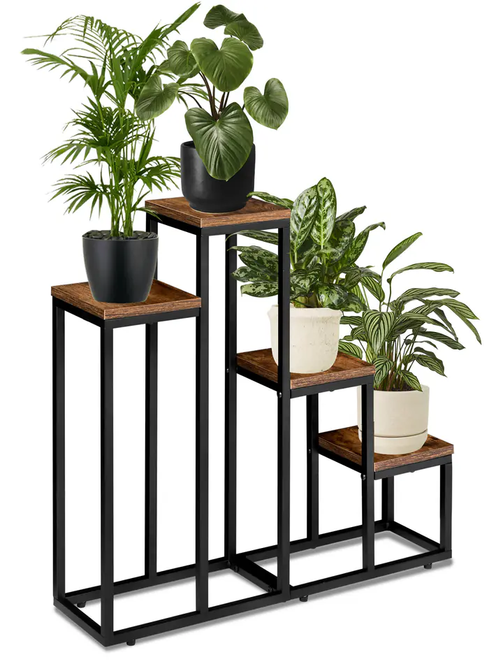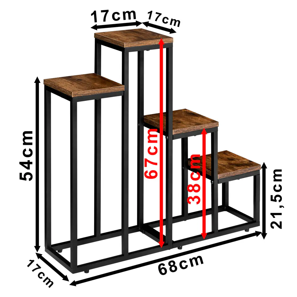 Kwietnik stojący czarny Pallen postarzany dąbPrzeznaczenie: salon, biuro | Kolory: czarny | Zakup od producenta⭐️ Cztery półki na kwiaty⭐️ Trwała metalowa konstrukcja⭐️ Możliwość wypoziomowania⭐️ Nowoczesny design Pallen to kwietnik wykonany z solidnej, malowanej proszkowo stali oraz płyty laminowanej w kolorze postarzanego dębu. Ma prosty i atrakcyjny design, który pasuje do różnych wnętrz, w tym stylu loftowego, klasycznego i industrialnego. Dzięki wytrzymałej stalowej konstrukcji oraz stabilnym półkom, kwietnik utrzymuje nawet ciężkie kwiaty i dekoracje. Jest również wyposażony w ochronne podkładki i wykonany z najwyższej jakości materiałów. Pallen to idealny wybór dla osób, które chcą eksponować swoje rośliny w wyjątkowy sposób.Ten produkt ma stalową konstrukcję malowaną proszkowo na czarny mat, co nadaje mu elegancki wygląd. Półka wykonana jest z laminatu w kolorze postarzanego dębu, co dodaje mu ciepła i przytulności. Produkt może wytrzymać maksymalne obciążenie do 10 kg, dzięki czemu nadaje się do przechowywania różnych rzeczy. Waży tylko 2 kg, co czyni go łatwym do przenoszenia i montażu. Podkładki ochronne z możliwością regulacji poziomu zapewniają stabilność i chronią podłogę przed zarysowaniem. SpecyfikacjaKonstrukcja: stal malowana proszkowo na czarny matPółki: laminowane w kolorze postarzany dąbMaksymalne obciążenie: 20 kgWaga: 5,1 kg WymiaryWysokość całkowita 67 cmSzerokość stelaża 68 cmGłębokość stelaża 17 cmPółka 17 cm x 17 cmGrubość płyty 1,5 cmProfil konstrukcji 1,5 cm Informacje dodatkowePrzedstawione kolory należy traktować poglądowo - mogą odbiegać od rzeczywistych ze względu na różne ustawienia monitorów oraz proces obróbki zdjęć. Rzeczywiste wymiary mogą się różnić od podanych wyżej. Tolerancja błędów może wynosić +/- 5%. Marka:LoftInspiredKod EAN produktu:5902340328361Kolor:czarnyWysokość:67 cmSzerokość:68 cmGłębokość:17 cmGrubość płyty:1,5 cm