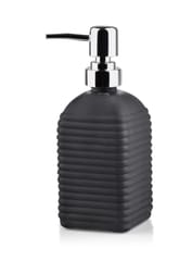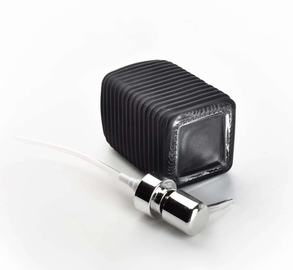 Szklany dozownik z serii KYLE marki BATHLAB by MONDEX. Posiada srebrną pompkę która ułatwia wydobycie się mydła na zewnątrz. Dozownik na mydło w płynie KYLE cechuje się dokładnym wykonaniem. Idealny czarny matowy pojemnik w poziome tłoczone paski.Wybór dla osób szukających użytecznych produktów stanowiących jednocześnieelementy dekoracyjne łazienek. dozownik z pompką wysokość 19cmdługość 7.8cmszerokość 7cmpojemność 450mlwhite box 8x8xh19.5cm