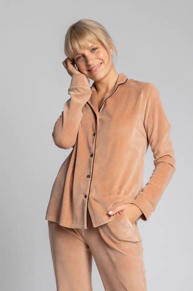 Zafunduj sobie odrobinę luksusu i zaśnij w miękkiej welurowej koszuli z kołnierzykiem i kontrastową wypustką. Materiał składa się w 80% z bawełny, jest ciepły i przyjemny w dotyku. Koszula najlepiej wygląda w zestawie z naszymi spodniami w tym samym stylu.