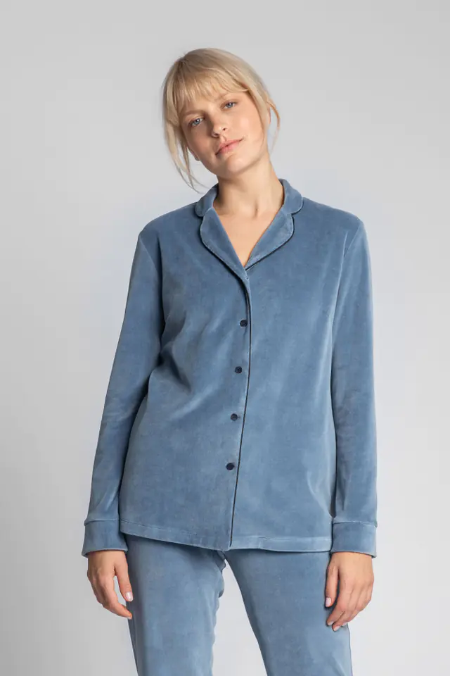 Zafunduj sobie odrobinę luksusu i zaśnij w miękkiej welurowej koszuli z kołnierzykiem i kontrastową wypustką. Materiał składa się w 80% z bawełny, jest ciepły i przyjemny w dotyku. Koszula najlepiej wygląda w zestawie z naszymi spodniami w tym samym stylu.