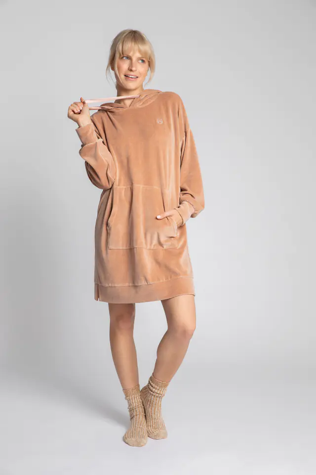LA010 Welurowa sukienka z kapturem - beżowa kolor beż, rozmiar S/M