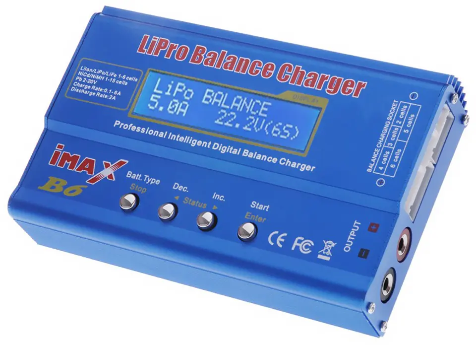 Imax B6 to niewielkich rozmiarów procesorowa ładowarka o mocy aż 80W przeznaczona jest do ładowania akumulatorów Ni-Cd, Ni-Mh, Li-Po, Li-Lo, Li-Fe, PB.