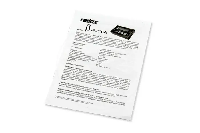 Redox Beta oferuje:Kompaktowe wymiaryMożliwość zasilania 12V lub 230VZoptymalizowane oprogramowanieWbudowany balancer pakietów litowychFunkcję rozładowania pakietówObsługę LiPo / LiFe Program szybkiego ładowania oraz ładowania w trybie przechowywania Maksymalne bezpieczeństwo pracy Automatyczne limity prądowe Programowalne limity pojemności Opcjonalny, aktywny sensor temperatury (nie zawarty w zestawie) Limity czasu ładowania Stałe monitorowanie napięcia wejściowego Zapisywanie i odczyt własnych ustawień ładowania Instrukcja w języku polskim