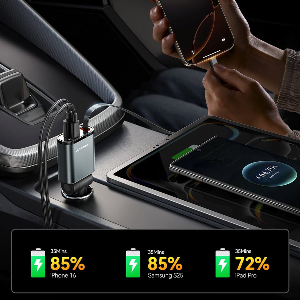 Kod produktu: 1030214Joyroom JR-CCL07 to ultrakompaktowa ładowarka samochodowa 3w1, która umożliwia szybkie i bezpieczne ładowanie aż trzech urządzeń jednocześnie. Wyposażona w zwijany kabel USB-C o długości 80 cm oraz dodatkowe porty USB-C i USB-A, zapewnia wygodę i porządek w aucie. Obsługuje szybkie ładowanie do 30 W (PD 3.0, PPS, QC4+), dzięki czemu błyskawicznie uzupełnia energię w smartfonach i tabletach. Lekka i smukła konstrukcja, aluminiowa obudowa oraz ognioodporny ABS gwarantują bezpieczeństwo i niezawodność w codziennym użytkowaniu.Najważniejsze cechy: