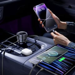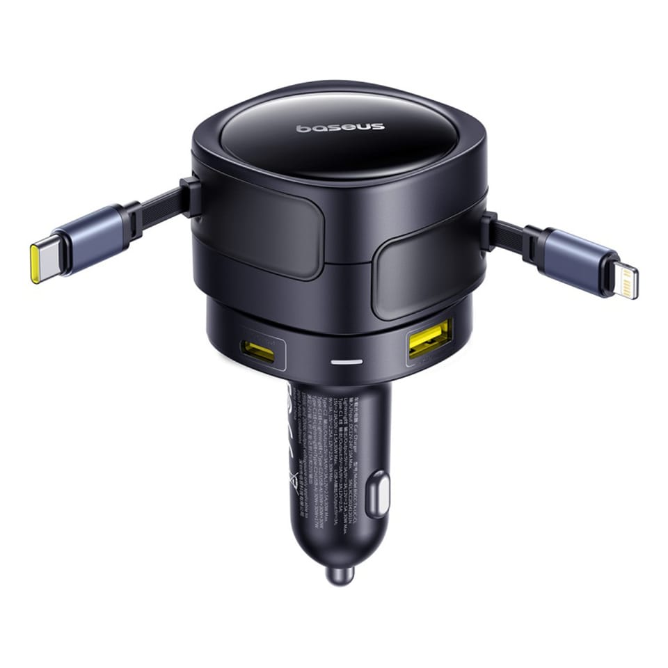 Ładowarka samochodowa Baseus z dwoma wbudowanymi kablami (USB-C i Lightning) i dwoma dodatkowymi portami (USB-C i USB-A) pozwala ładować jednocześnie aż cztery urządzenia z łączną mocą do 90 W. Zintegrowany system bezpieczeństwa, obrotowa konstrukcja i kompatybilność z napięciem 12–24 V zapewniają niezawodność w każdym pojeździe.