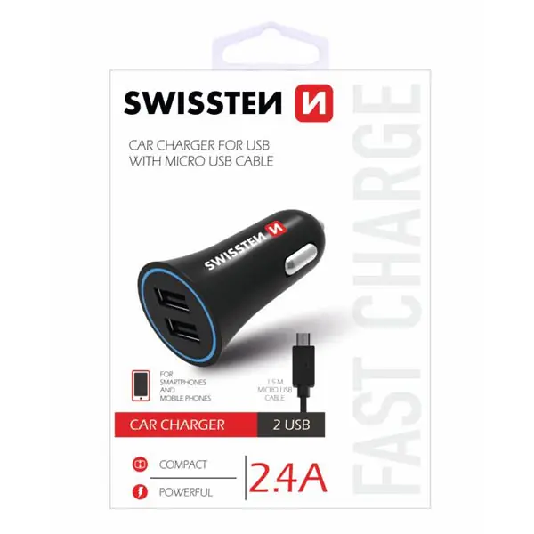 Ładowarka samochodowa SWISSTEN 12W, 2-portowy, USB-A, kabel microUSB