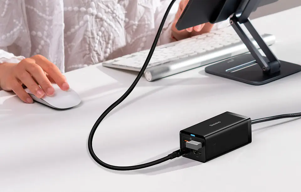 Aby użytkowanie produktu Baseus było dla Ciebie jak najdogodniejsze, zadbano o każdy szczegół. Do zestawu dołączono kabel USB4, który umożliwia przesył danych z prędkością 40 Gbps i ładowanie z mocą 100 W oraz przedłużacz o długości 1.5 m. Wszystko w trosce o Twoją wygodę! Ładowarka wyposażona jest 4 porty: USB-C1 (67 W) umożliwia szybkie ładowanie laptopów, tabletów i telefonów. USB-C2 (67 W) pozwala na ładowanie i transfer danych. Dzięki portowi HDMI wyświetlisz obraz z wybranego urządzenia na projektorze czy telewizorze. Poprzez port USB podłączysz mysz, klawiaturę lub adapter. Możliwe jest także ładowanie urządzeń niskoprądowych, takich jak słuchawki.