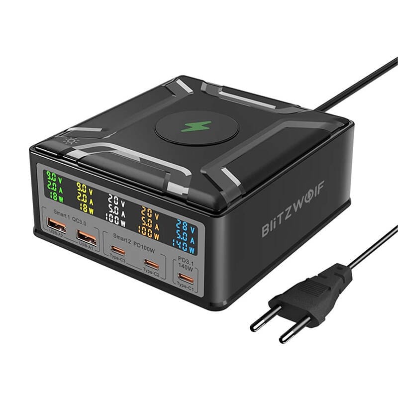 Ładowarka sieciowa BlitzWolf BW-S28 to zaawansowane rozwiązanie do ładowania wielu urządzeń jednocześnie. Dzięki maksymalnej mocy wyjściowej 260 W i pięciu portom (2x USB-A, 3x USB-C) pozwala na efektywne zasilanie nawet pięciu sprzętów naraz. Produkt wyróżnia się także szeroką kompatybilnością i cyfrowym wyświetlaczem zapewniającym dostęp do informacji o aktualnych parametrach prądu. Umożliwia też ładowanie bezprzewodowe, co dodatkowo zwiększa jego funkcjonalność.