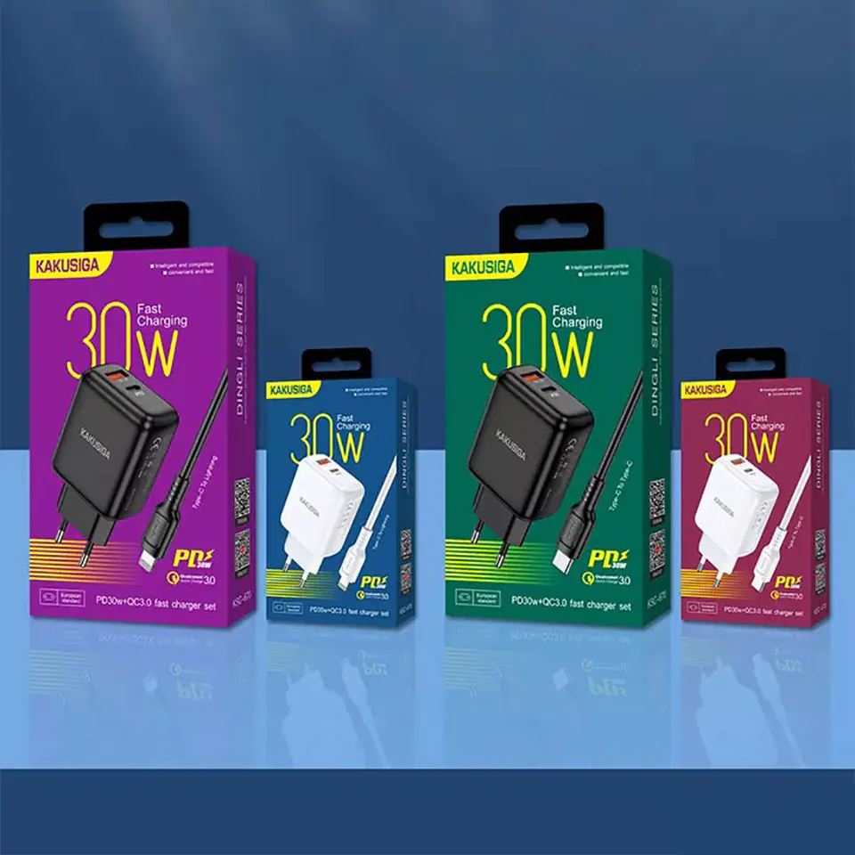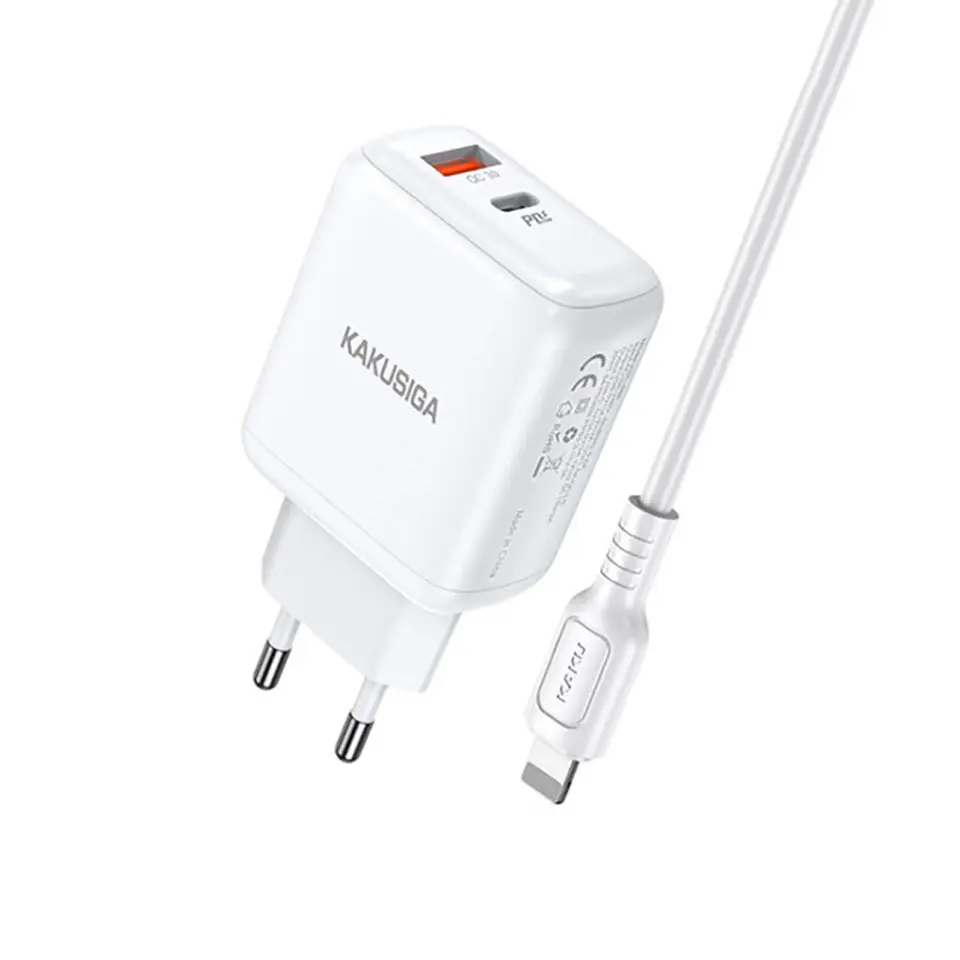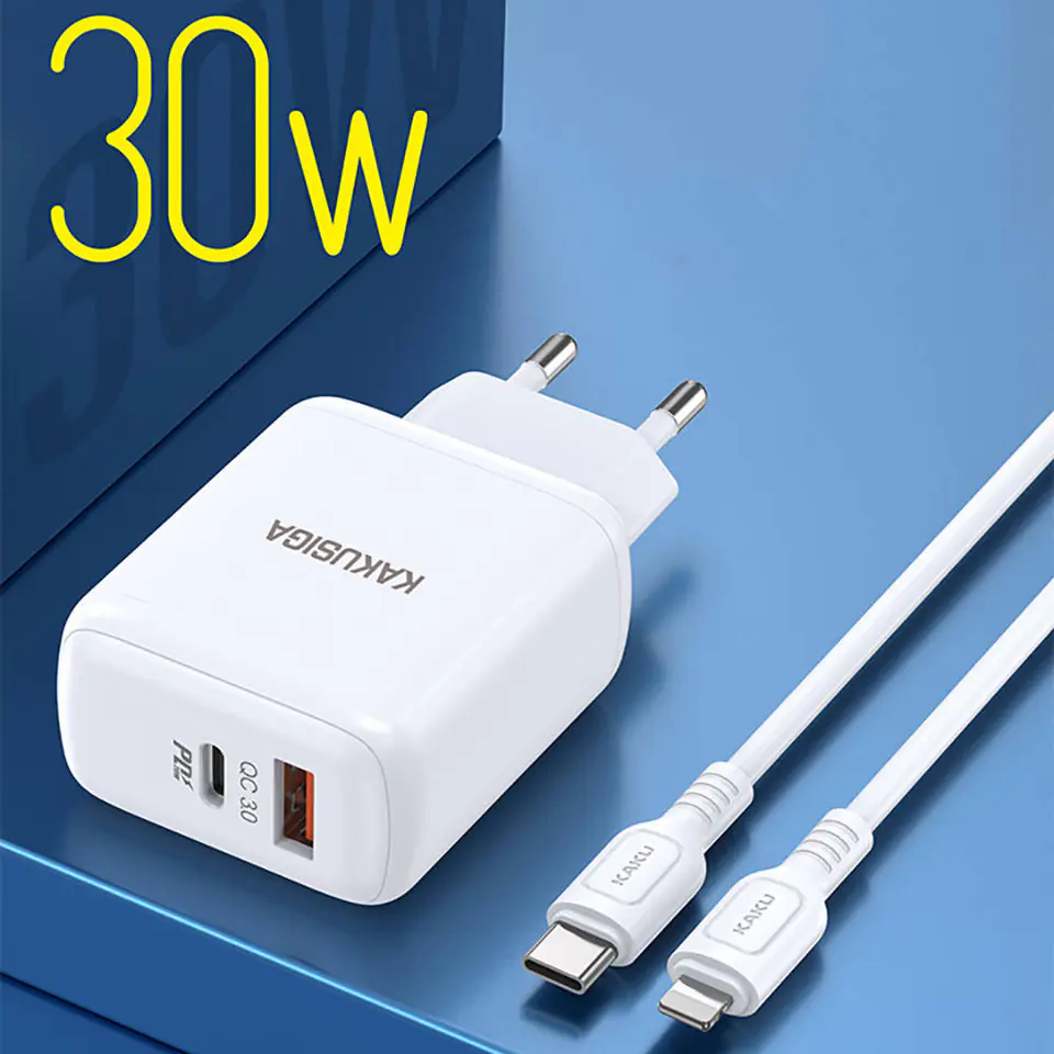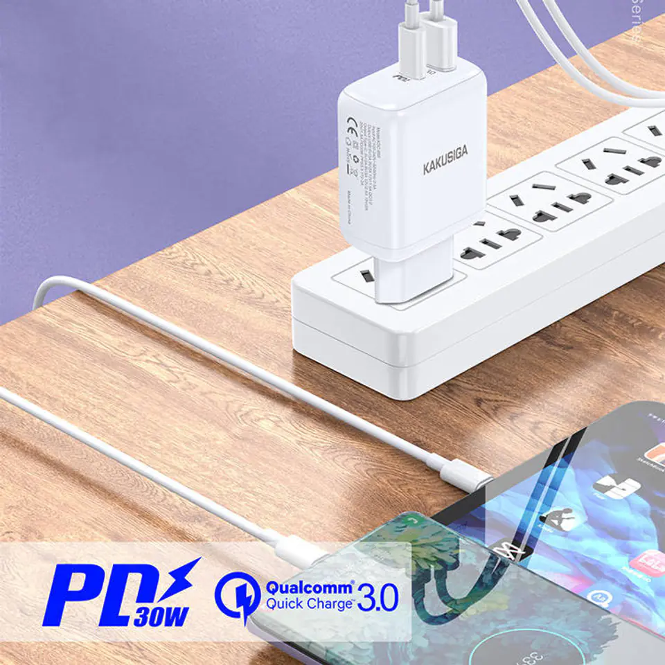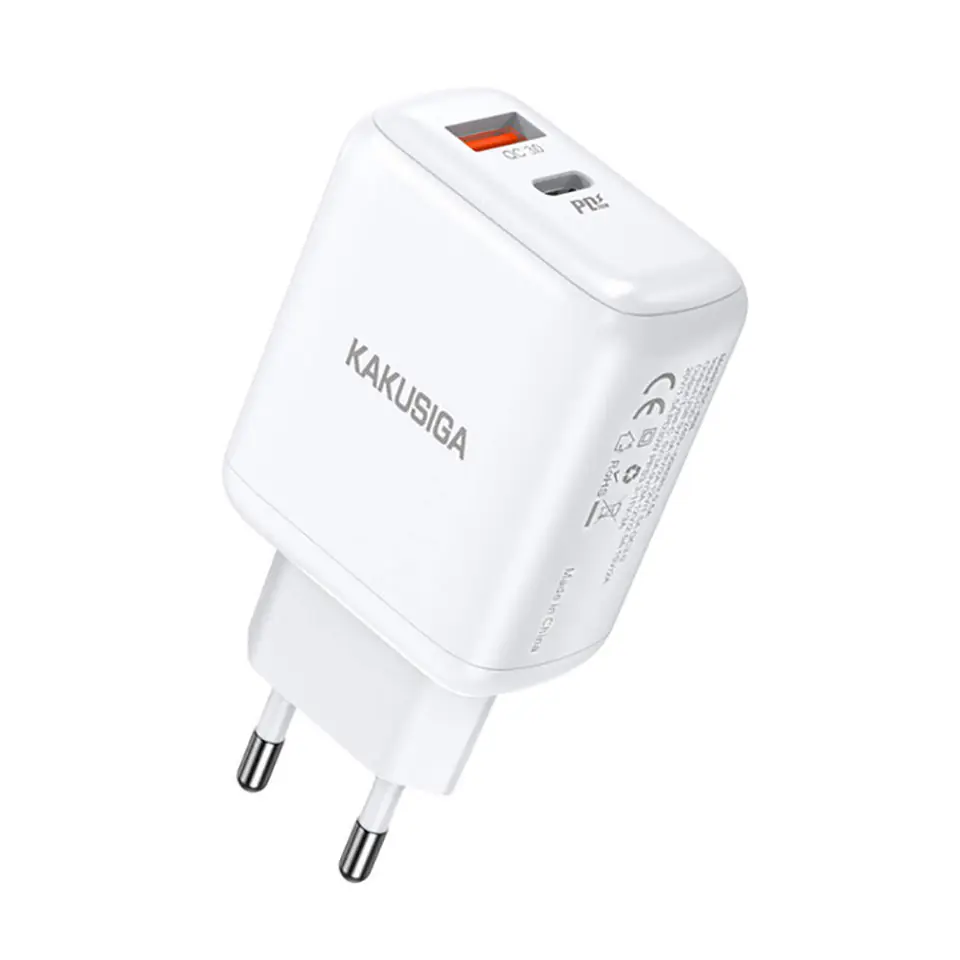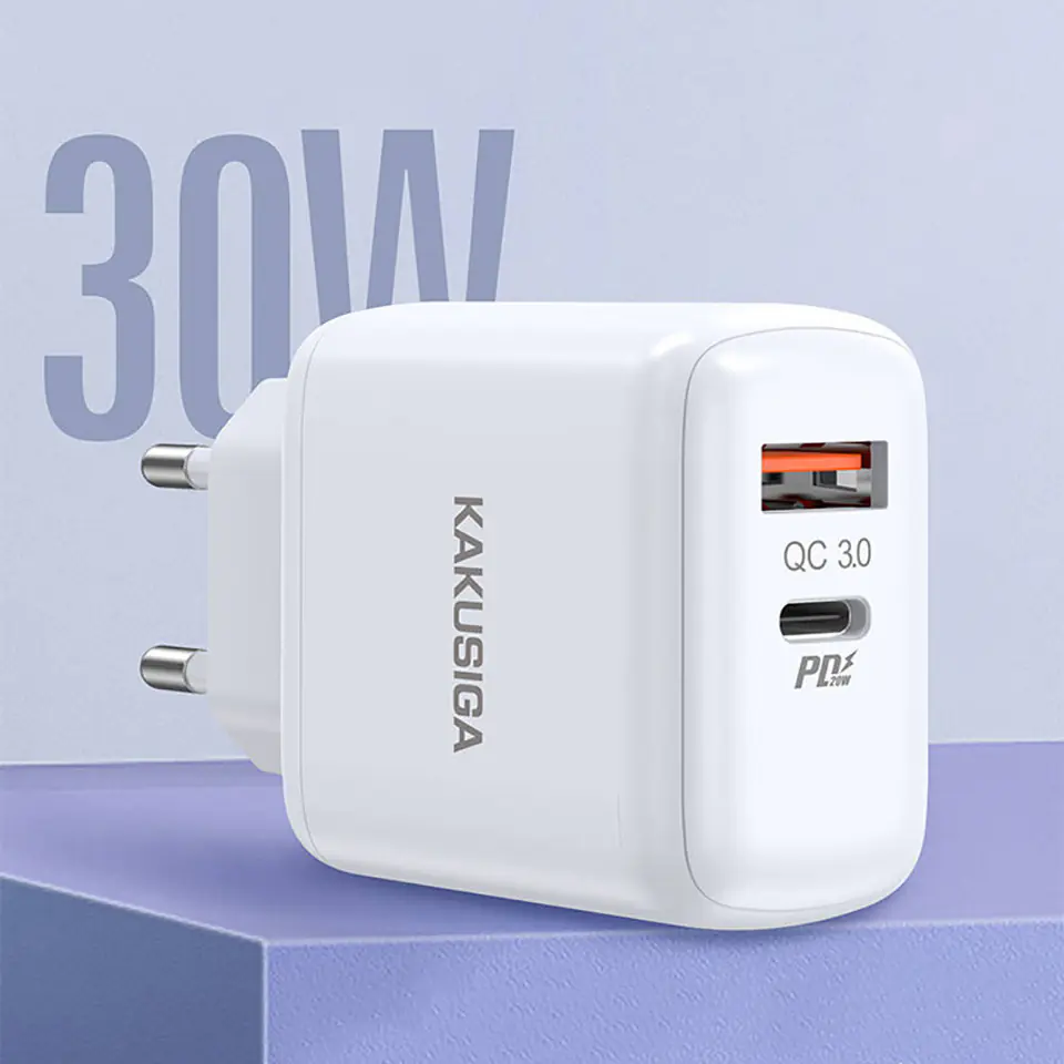 Kompaktowa ładowarka sieciowa Kakusiga KSC-670 wyposażona w 2 porty: USB-C ze standardem PowerDelivery 3.0 oraz standardowym USB Quick Charge o łącznej mocy wyjściowej 30W.
