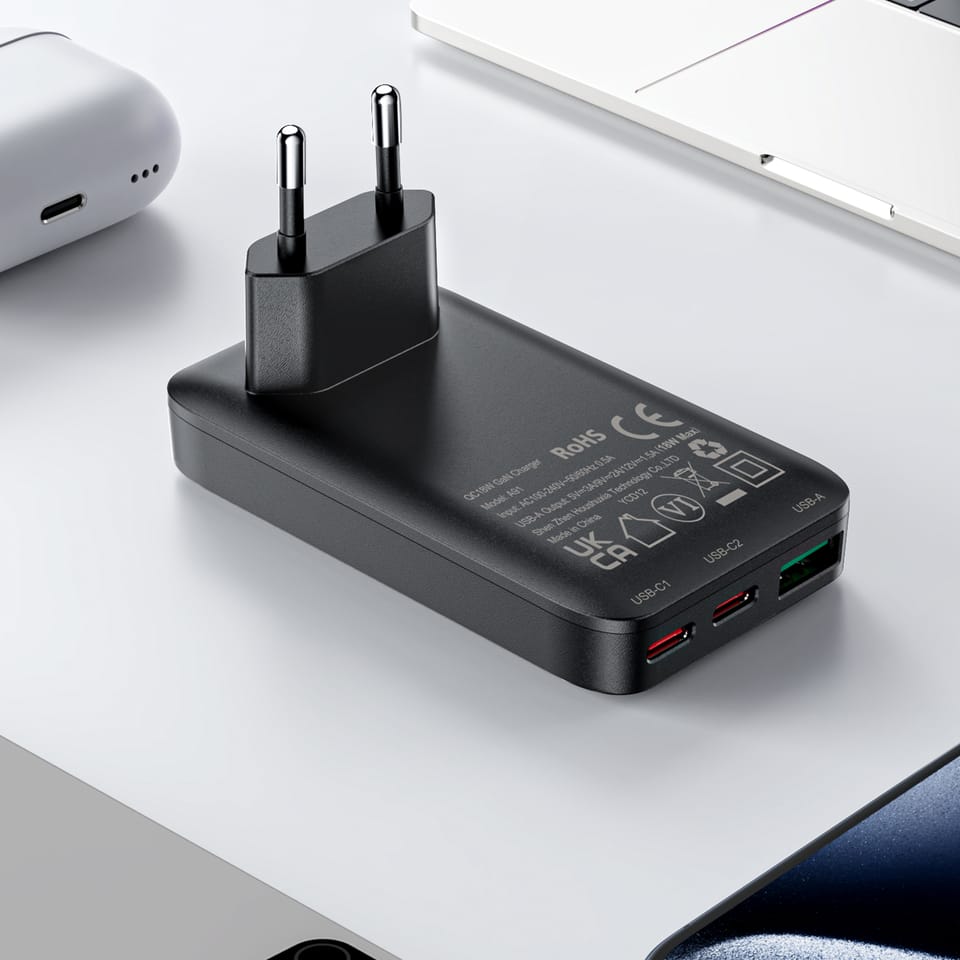 - - Trzy porty ładowania - Dwa porty USB-C i jeden port USB-A umożliwiają jednoczesne ładowanie trzech urządzeń, co czyni tę ładowarkę wyjątkowo praktycznym rozwiązaniem w każdym środowisku.
