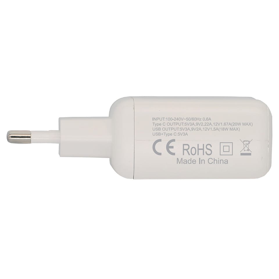 Bardzo szybka ładowarka sieciowa działająca w technologii PD20W oraz QC3.0: dwa porty: USB + USB typu Cprzeznaczona do ładowania telefonów, tabletów, oraz innych urządzeń ładowanych z USBwejście sieciowe: 100-240V~50/60Hz 0,6Awyjście USB type-C zgodne z PD20W: 5V / 3A; 9V / 2,22A; 12V / 1,67Awyjście USB zgodne z QC3.0: 5V / 3A; 9V / 2A; 12V / 1,5A;wtyczka EUmateriał ABSwaga 46gOSTRZEŻENIA ładowarka przystosowana do prazy z prądem 100-240V~50/60Hznie próbować otwierać obudowy ładowarkiunikać narażania ładowarki na pracę w warunkach zwiększonej wilgotności powietrza