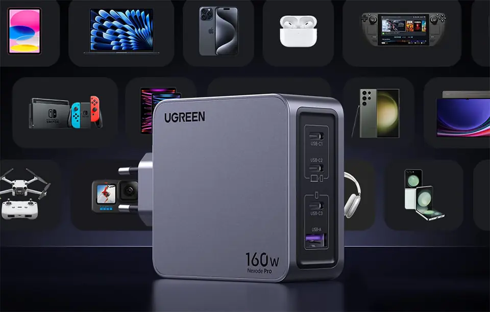 Z ładowarką UGREEN Nexode Pro ładowanie zajmie jeszcze mniej czasu! Zapewnia ona moc aż 160 W i wspiera wiele standardów szybkiego ładowania, co przekłada się na jeszcze krótszy czas odnawiania energii podłączonego urządzenia. Wykorzystuje zaawansowaną technologię GaN, a dzięki 4 dostępnym portom USB możesz jednocześnie ładować nawet cztery sprzęty.